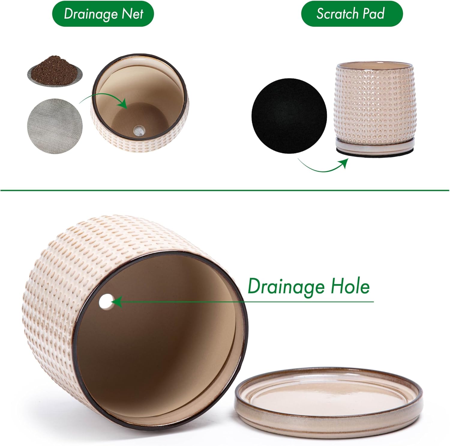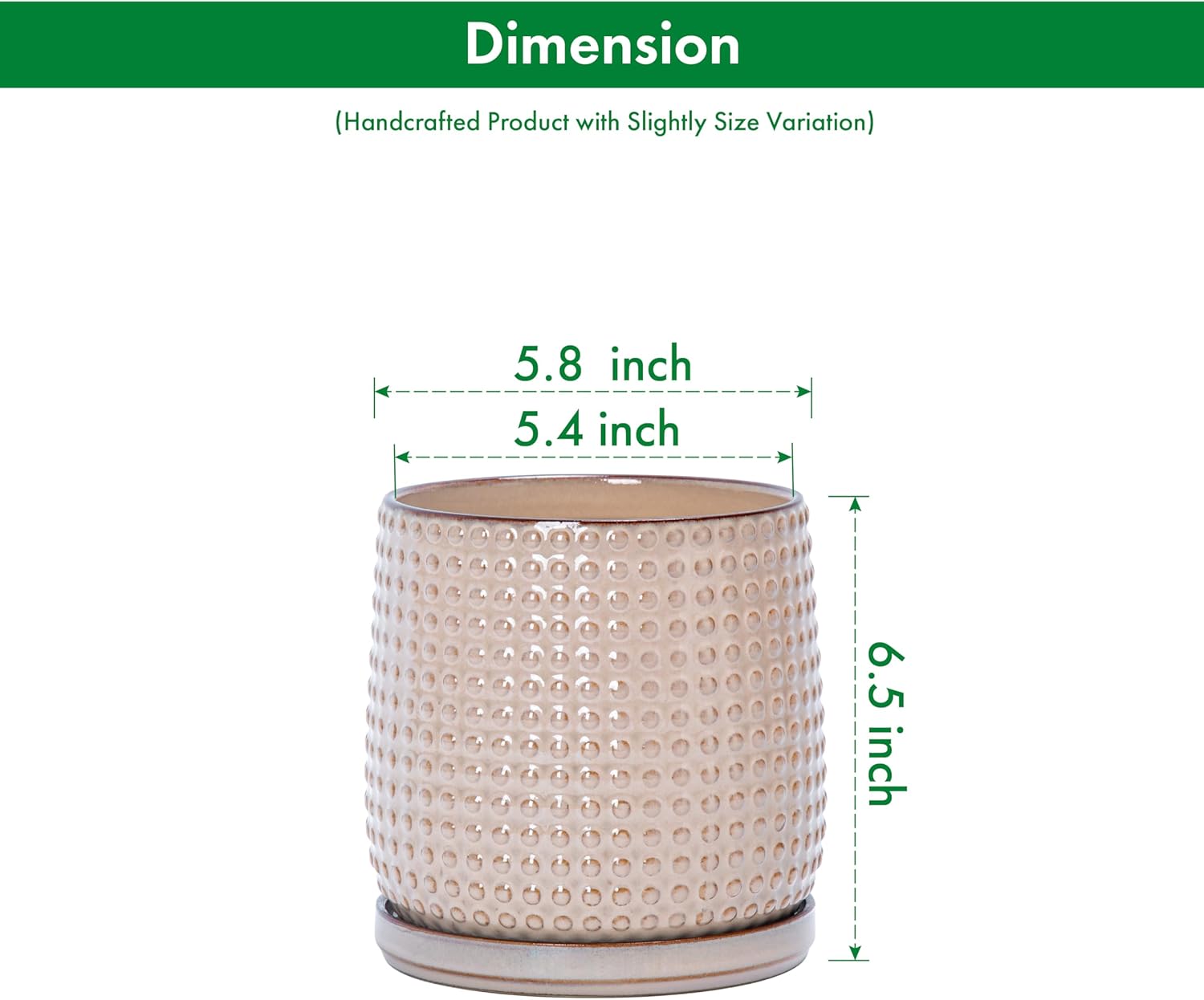 D'vine Dev 6 Inch Ceramic Beaded Stoneware Planter Pot - Flower Pot with Drainage Holes and Saucers for Indoor Succulent Plants or Flowers, Light Brown, 27-C-X-4