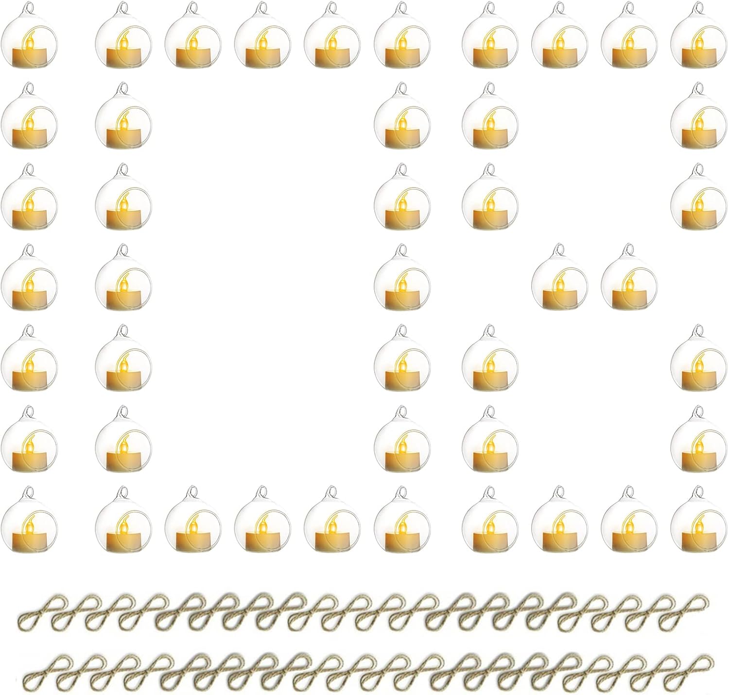 - PACKAGE INCLUDES: You would receive 108pcs hanging candle holder & 108pcs led tea light & 108pcs 3.28 Ft jute twine strings.
