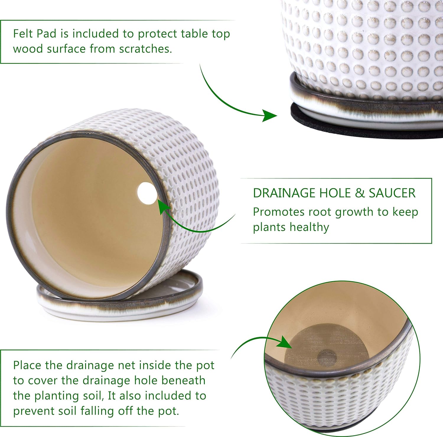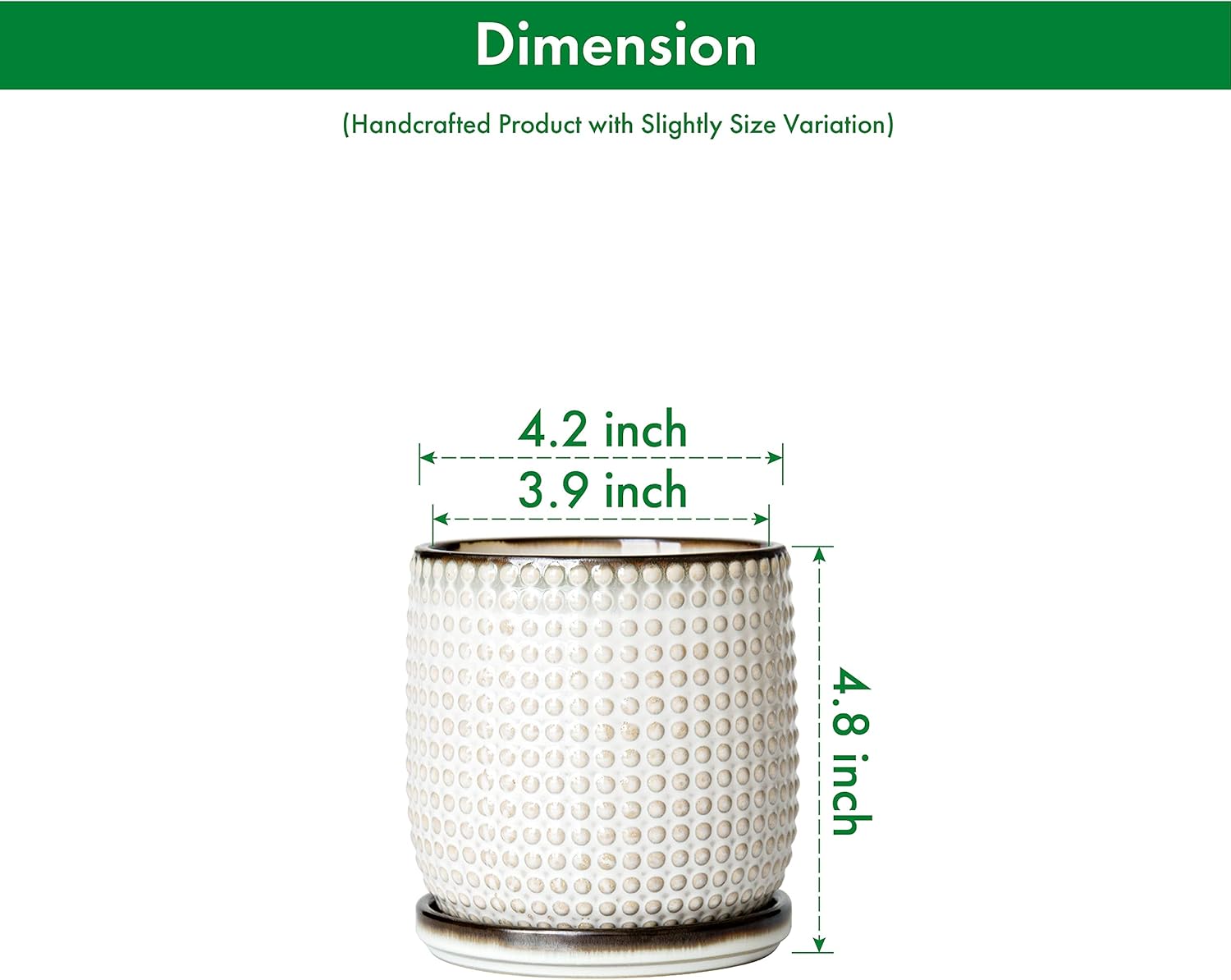 D'vine Dev 4 Inch Ceramic Beaded Stoneware Planter Pot - Flower Pot with Drainage Holes and Saucers for Indoor Succulent Plants or Flowers, Smoked White, 27-C-Z-1