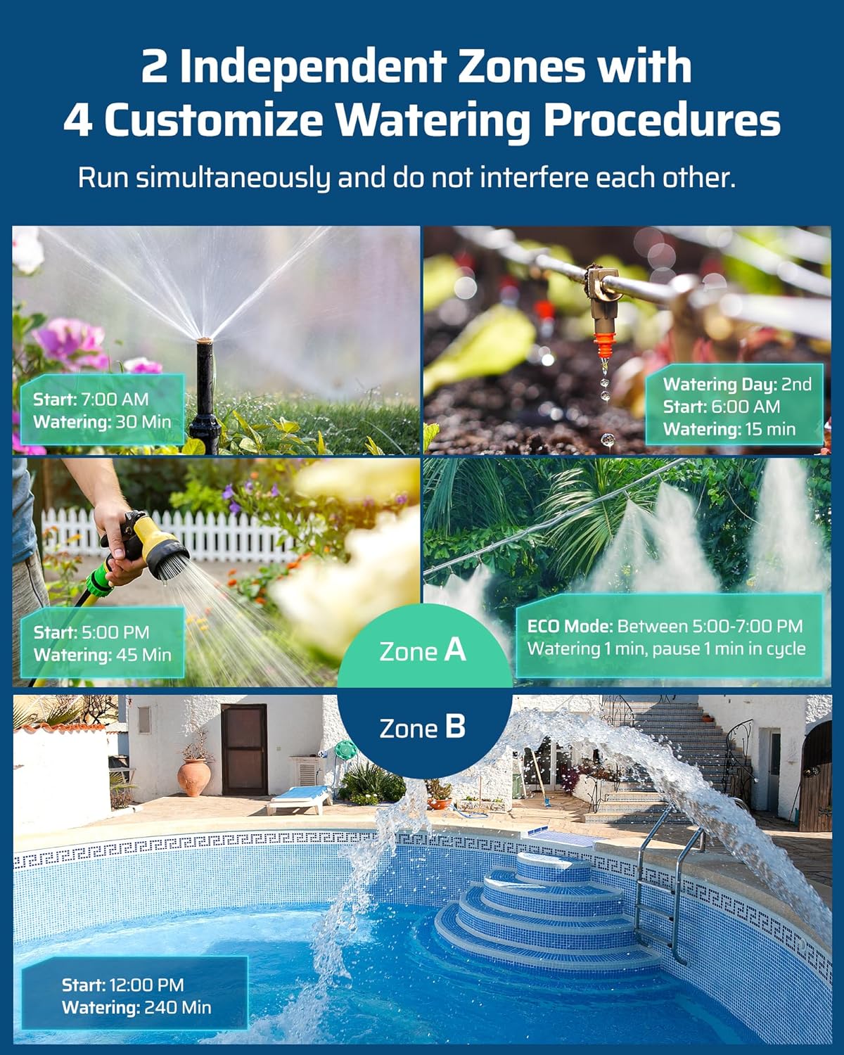 - [8 Programs for 2 Independent Zones] 2 zones( A and B) can be controlled independently on the same day, each zone has up to 4 watering cycles per day, this water-efficient sprinkler timer can meet your watering needs with different hoses throughout the day, ideal for sprinkler, watering or drip irrigation systems for lawn, garden, yard, potted plants, vegetable, etc.