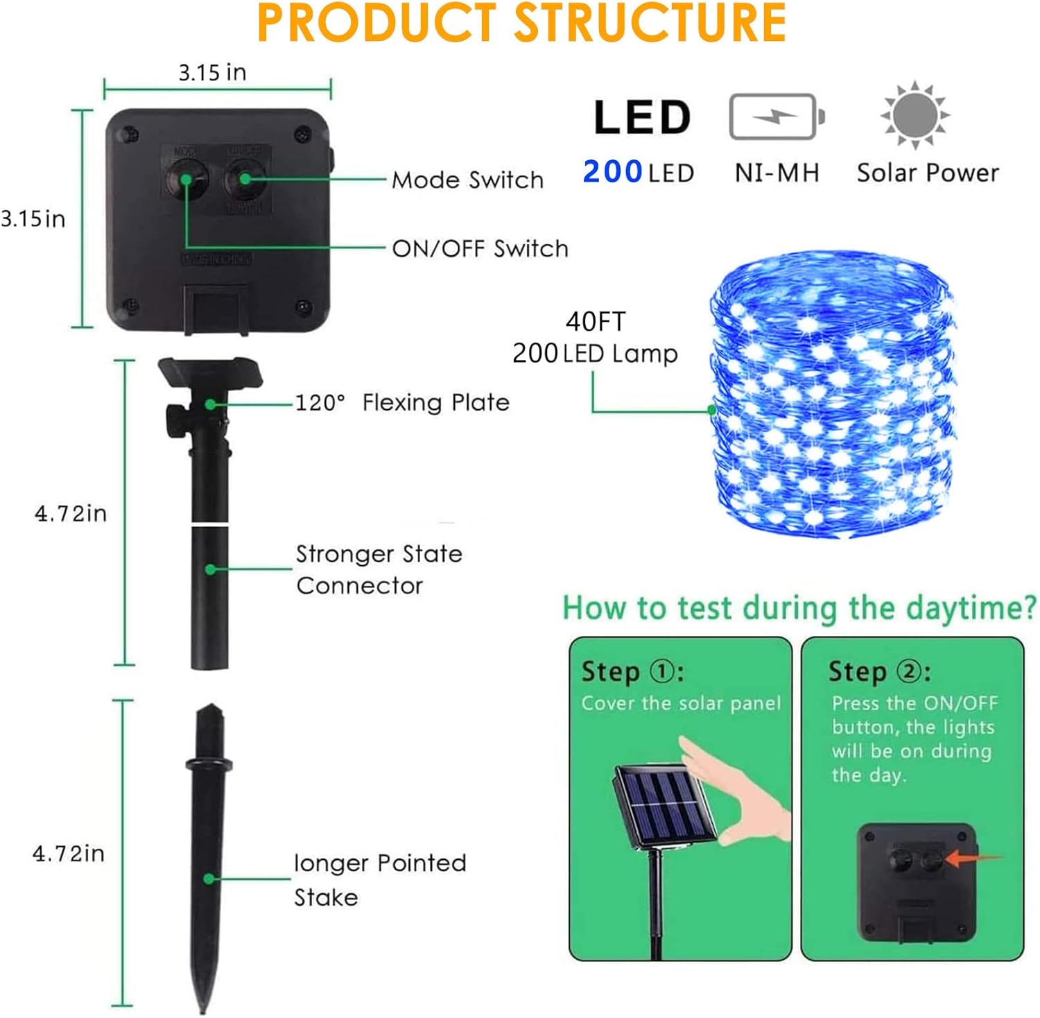 - [Solar Powered & Auto On/Off]: These string lights for outside are solar powered and waterproof, with no electricity cost. A larger solar panel with quick charging technology ensures higher solar energy conversion. After 8 hours of full charge, they work up to 10-12 hours. Simply place the battery panel in a sunny area, and the lights will automatically charge during the day and light up at night.