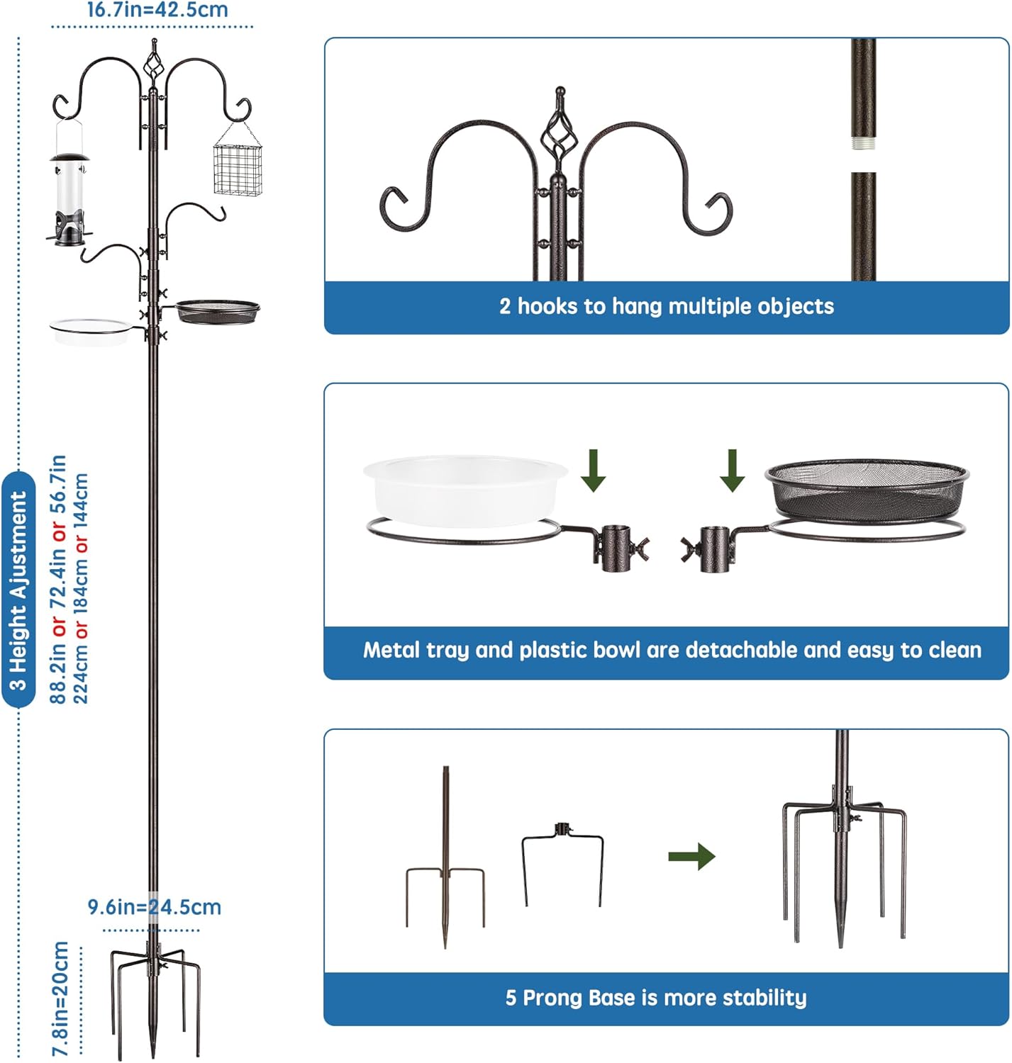 - EASY TO INSTALL BIRD FEEDER POLE: You can loosen and tighten the nuts manually, and you can easily adjust the components to any desired position. No tools are required to install bird feeding station! There are five prong bases in total, making it easier to fix this bird feeder extension pole. The bird feeding net tray and water bowl can be separated, and it is very convenient to clean. This wild bird feeder hanging is 91 inches tall and can hang more things