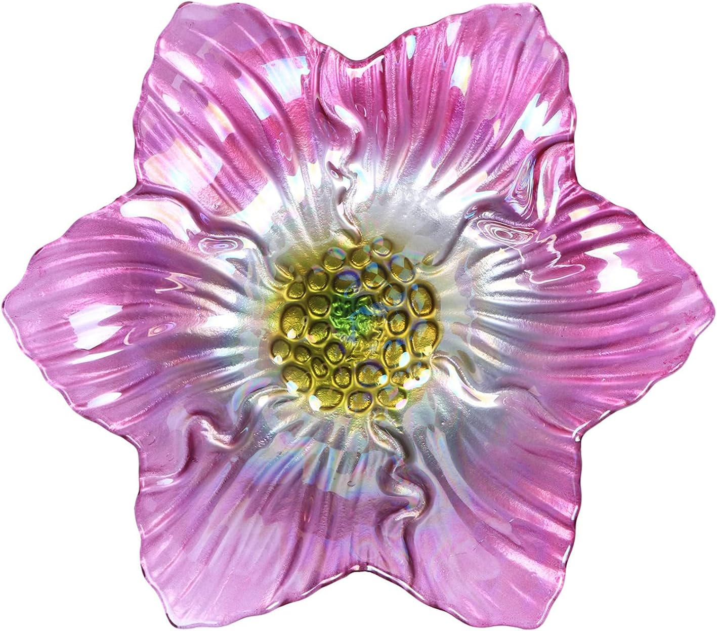 - Bird bath is designed with handmade glass painted with beautiful pink pattern, and metal stake base is upgraded to four-pronged bottom, which greatly increases the stability of birdbath