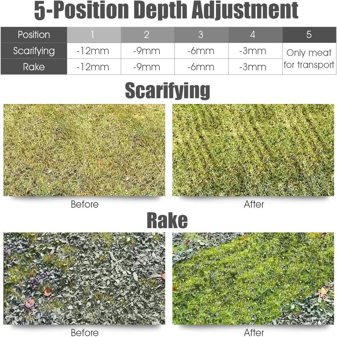 - 【5-Position Depth Control】The lawn dethatcher has a 4-position height adjustment that suits for different types of grass and level 0 is for transport. Moreover, you can easily choose a suitable depth by a lever to scarify your lawn and perforate soil to promote healthy grass growth.
