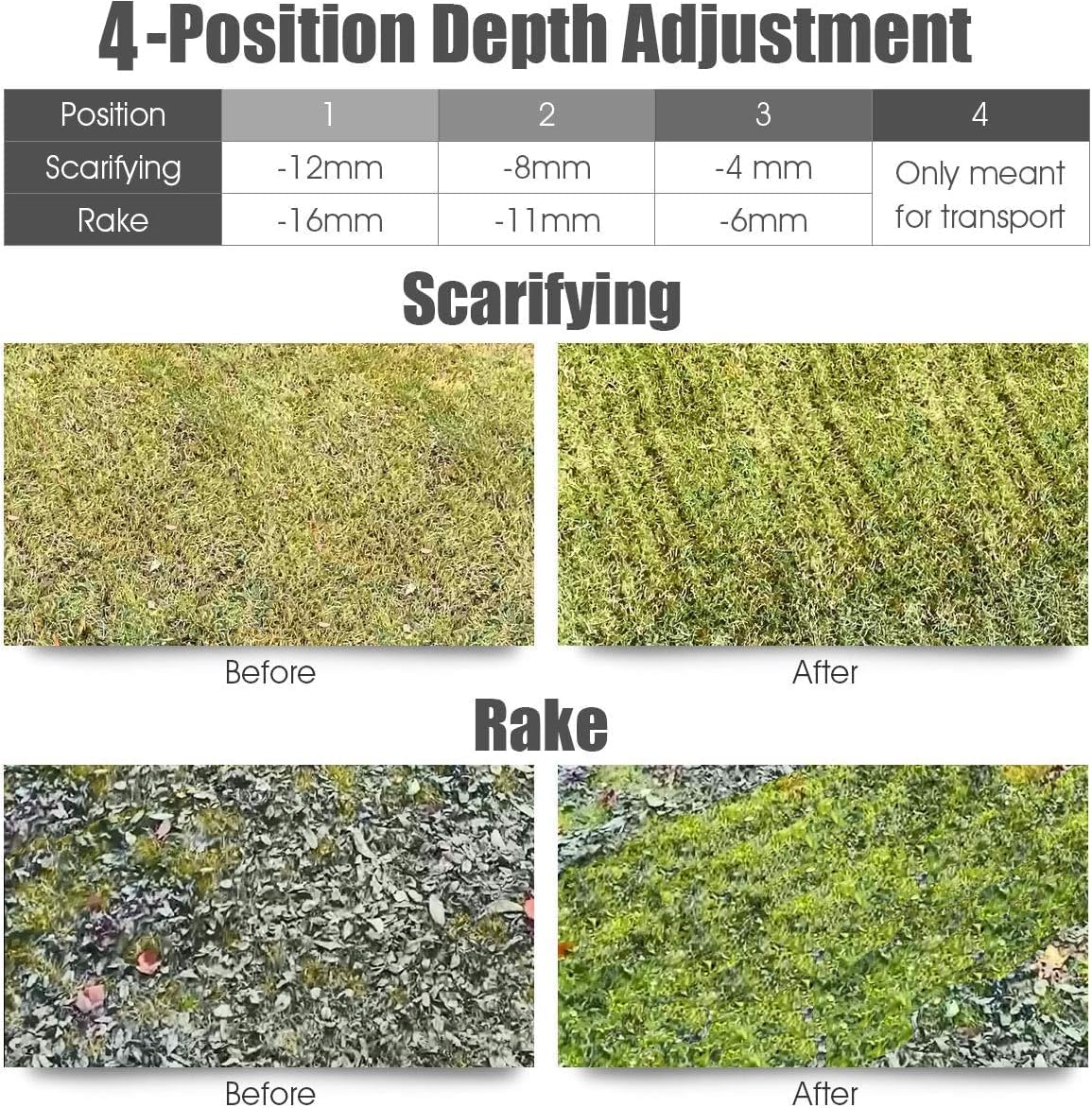 - 【4-Position Depth Control】Our electric dethatcher has 3 depth positions to choose and level 4 for transport, which can meet your different needs of garden tidiness. You can adjust the lever to a comfortable depth of grass removing and scarifying, which can prevent soil compaction and dispose lawn debris easily.
