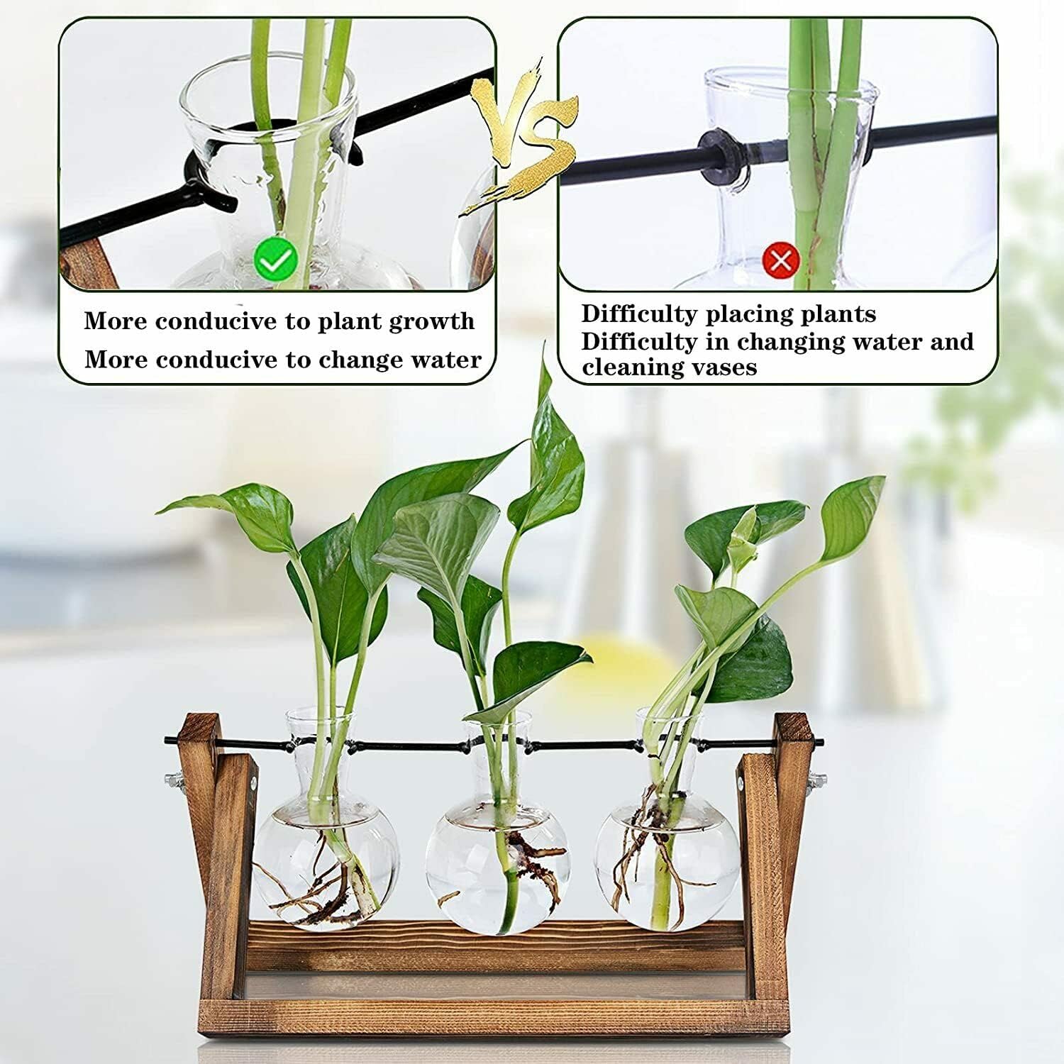 - Artistic Appearance: The plant bracket combines three different materials of glass bulb vase, wooden bracket and metal bracket, which reflects the decorator's artistic sense and unique taste. Great for plant propagation, hydroponic plants or living air plants, desktop, office, home and wedding decorations.