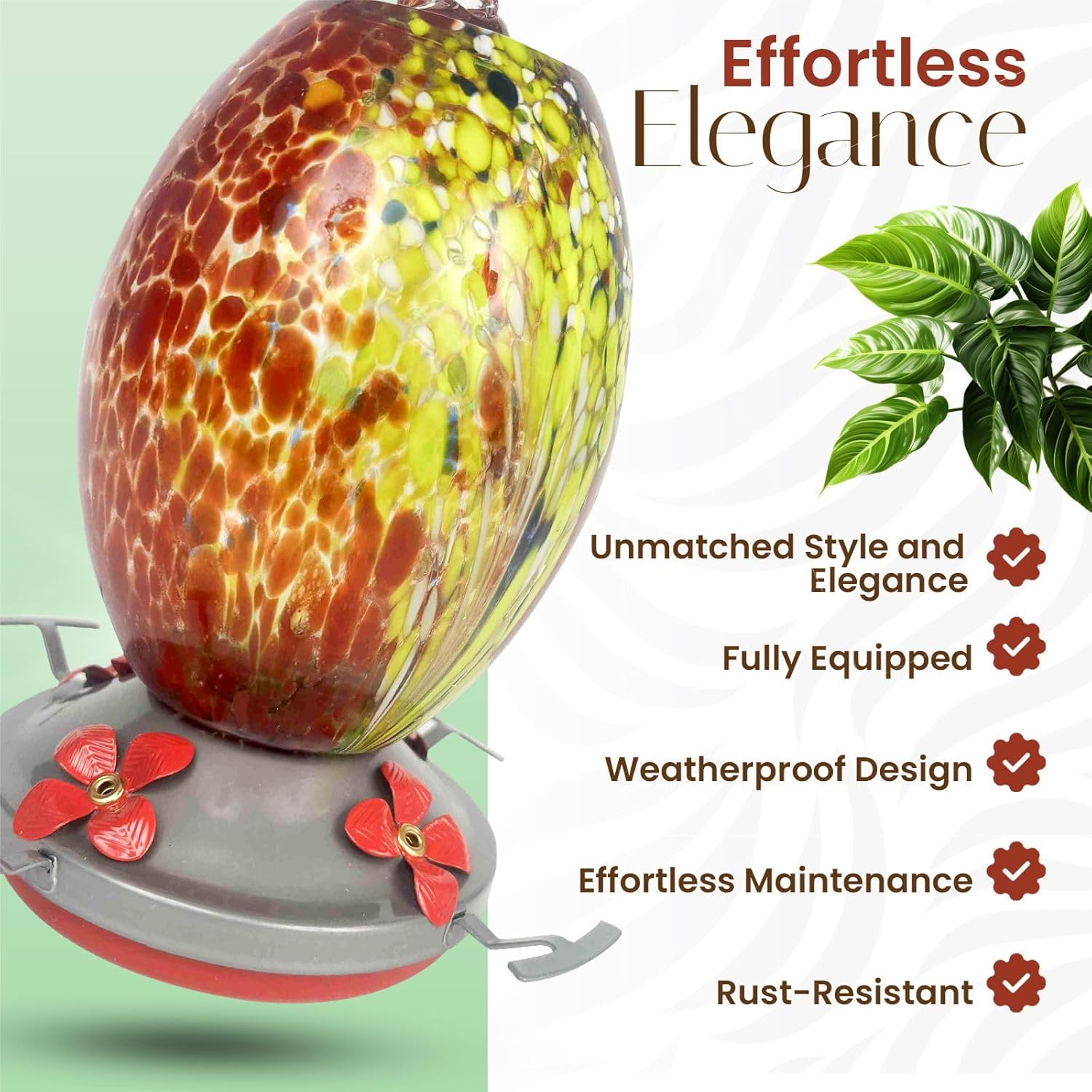 - Durable Materials: Crafted from premium, rust-resistant materials and hand blown glass, our hummingbird feeder with ant moat is easy to clean and built to last; It stands up to the elements, ensuring a safe and long-lasting haven for hummingbirds year-round