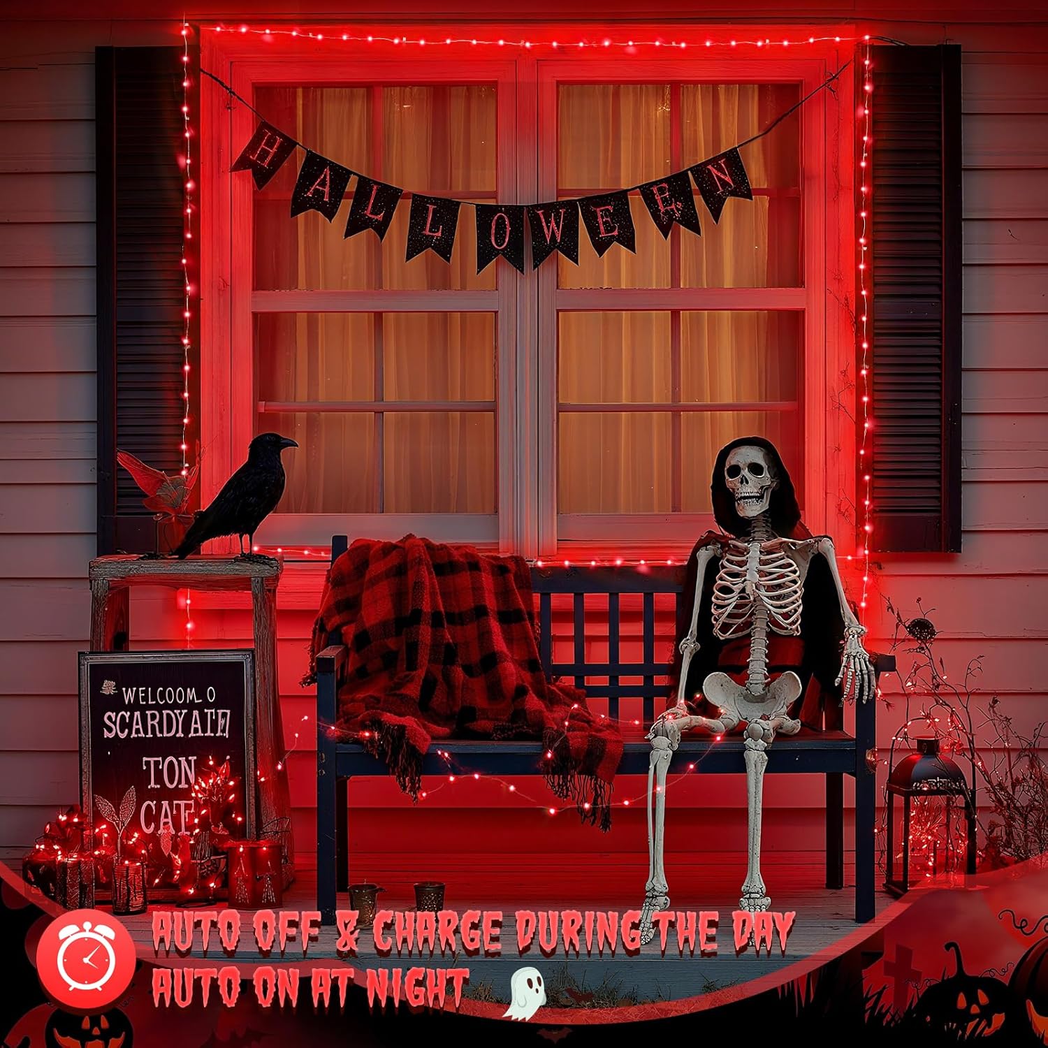 - 【FLEXIBLE & DURABLE RED LIGHTS OUTDOOR】You can bend the flexible silver wire into a heart shape or pentacle and you can wrap the halloween solar lights around tree trunks or gazebos. Solar fairy lights will not overheat after being used for many hours, durable, and safe to use.