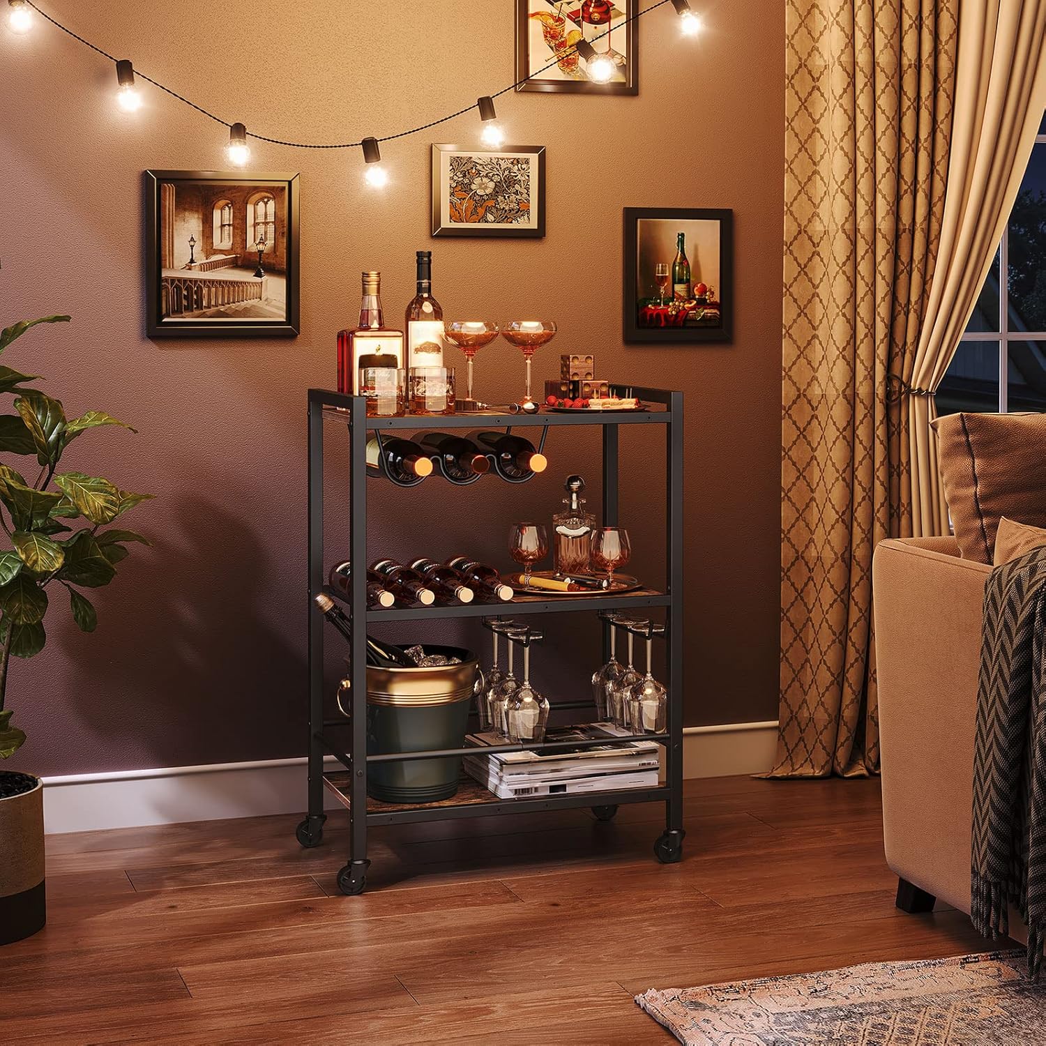 - Multi-Functional Bar Cart: Size of the wine bar cart for the home: 23.6''L x 12.8''W x 33.9''H. With 3-tier racks, movable wheels, wine racks and cup holder provides you with powerful storage space, and can also be used as a kitchen rack to store spices, dishes and fruits