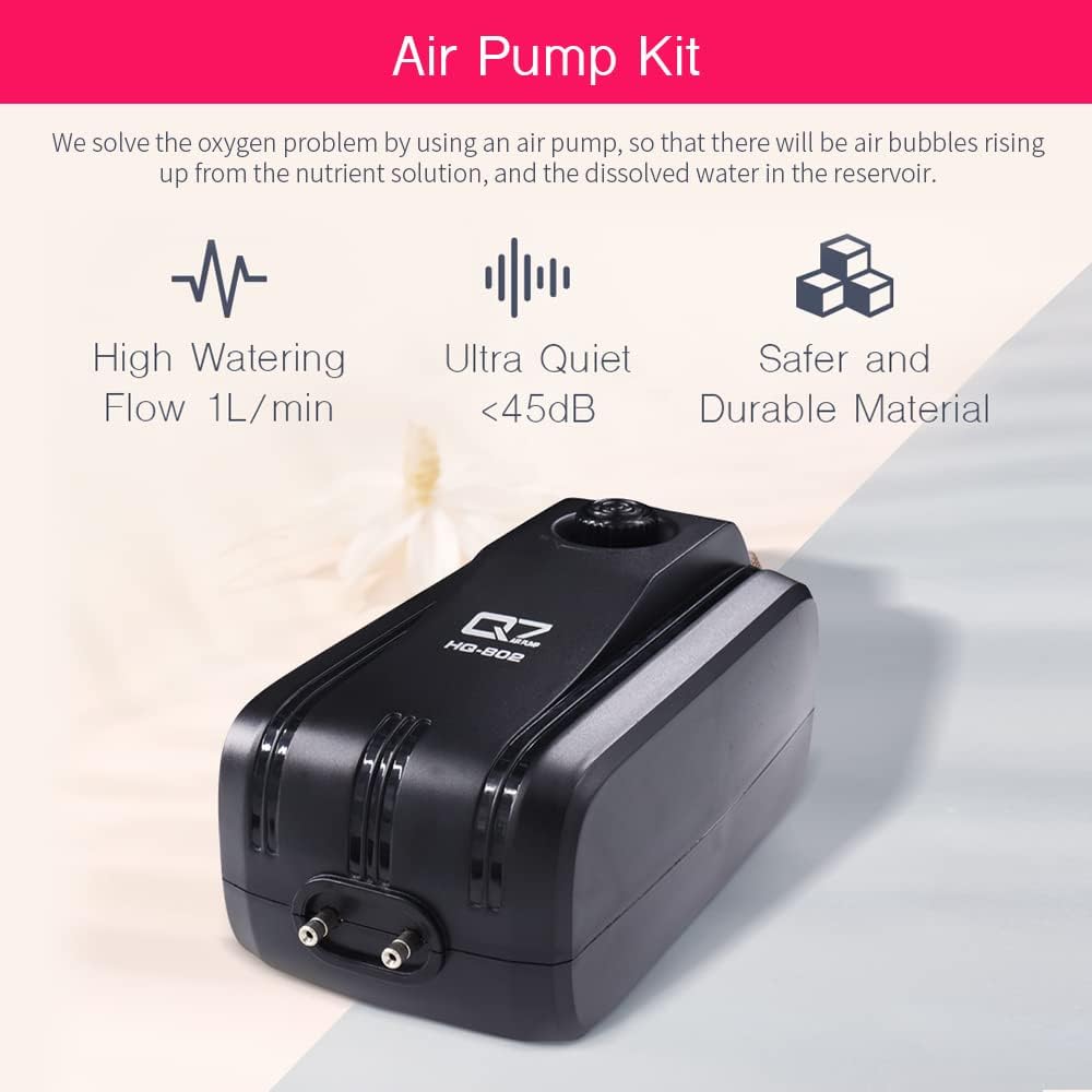 - EFFICIENT AIR PUMP KITS: Air Pump with 2 outlets, includes 2x Check Valve, 2x Air Stone, 2x 5ft Air Tubing. Large air outlet, adjustable air flow is up to 1L/min and UP TO 265 gallons. Air Stone is an ideal way to add oxygen to your hydroponic growing system and create tiny bubbles rather than bigger ones. Oxygenation of hydroponic reservoirs using air pumps is vital for the health of root system.