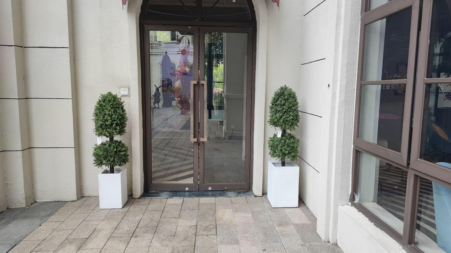 - GREENERY HOME TOPIARY TREE - To make it highly realistic, the artificial tree features PE leaves to imitate the real plant. The delicate texture and vivid color makes it look like a real one, and real wood trunk delivers the natural touch. Compared to real plants, this tree offers an evergreen view, which keeps all year green whenever.This Guihua Leaf double ball shape topiary tree are a great choice for garden/front porch door decor