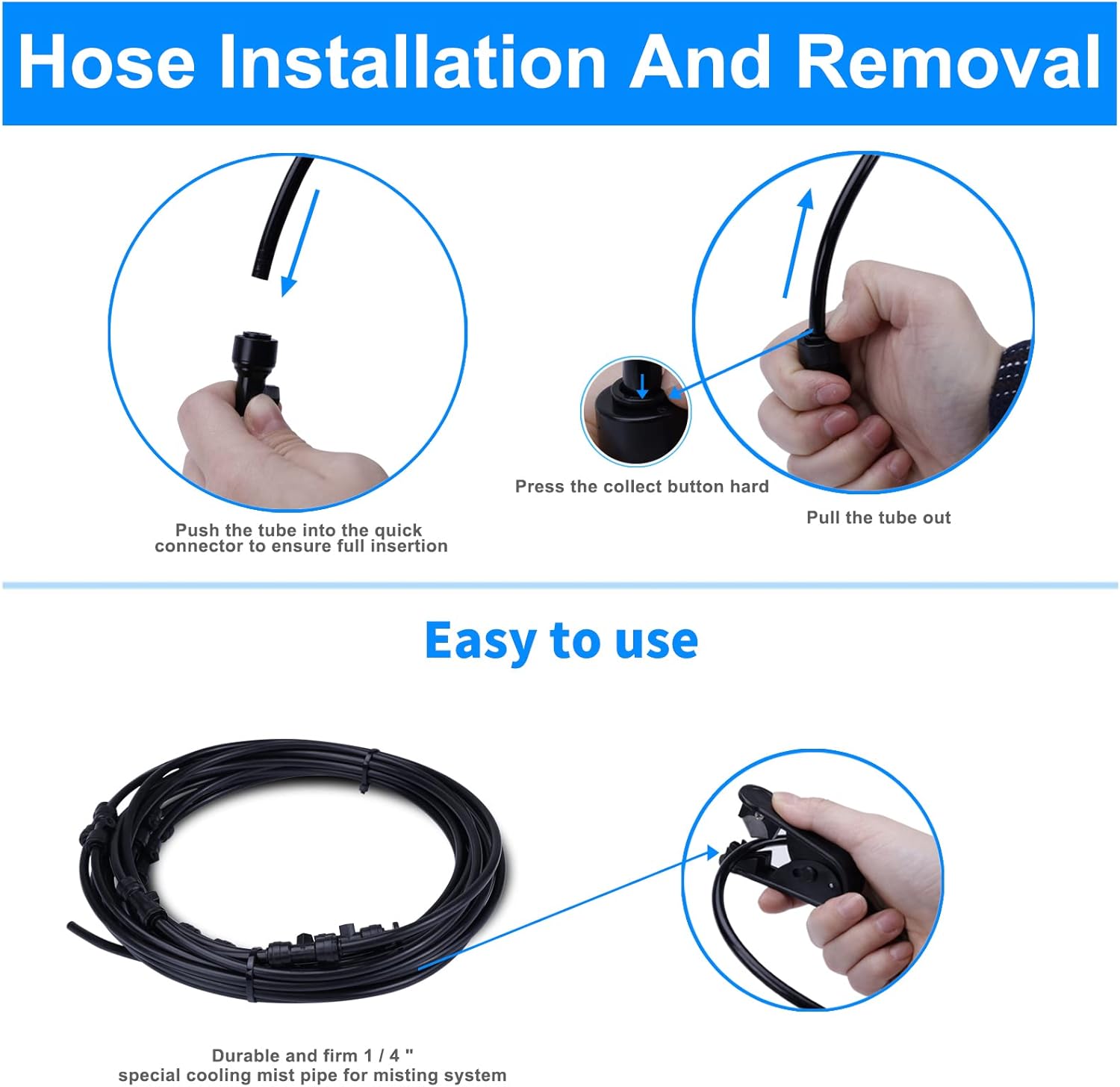 - [High-quality material]: Portable misting system is equipped with removable and washable stainless steel misting nozzles, which block impurities in the water and have strong anti-clogging ability. After long-term use, the nozzle can be removed for cleaning. Misting hose is made of UV material, which is not easy to break, prevents water leakage, and is safer to use.