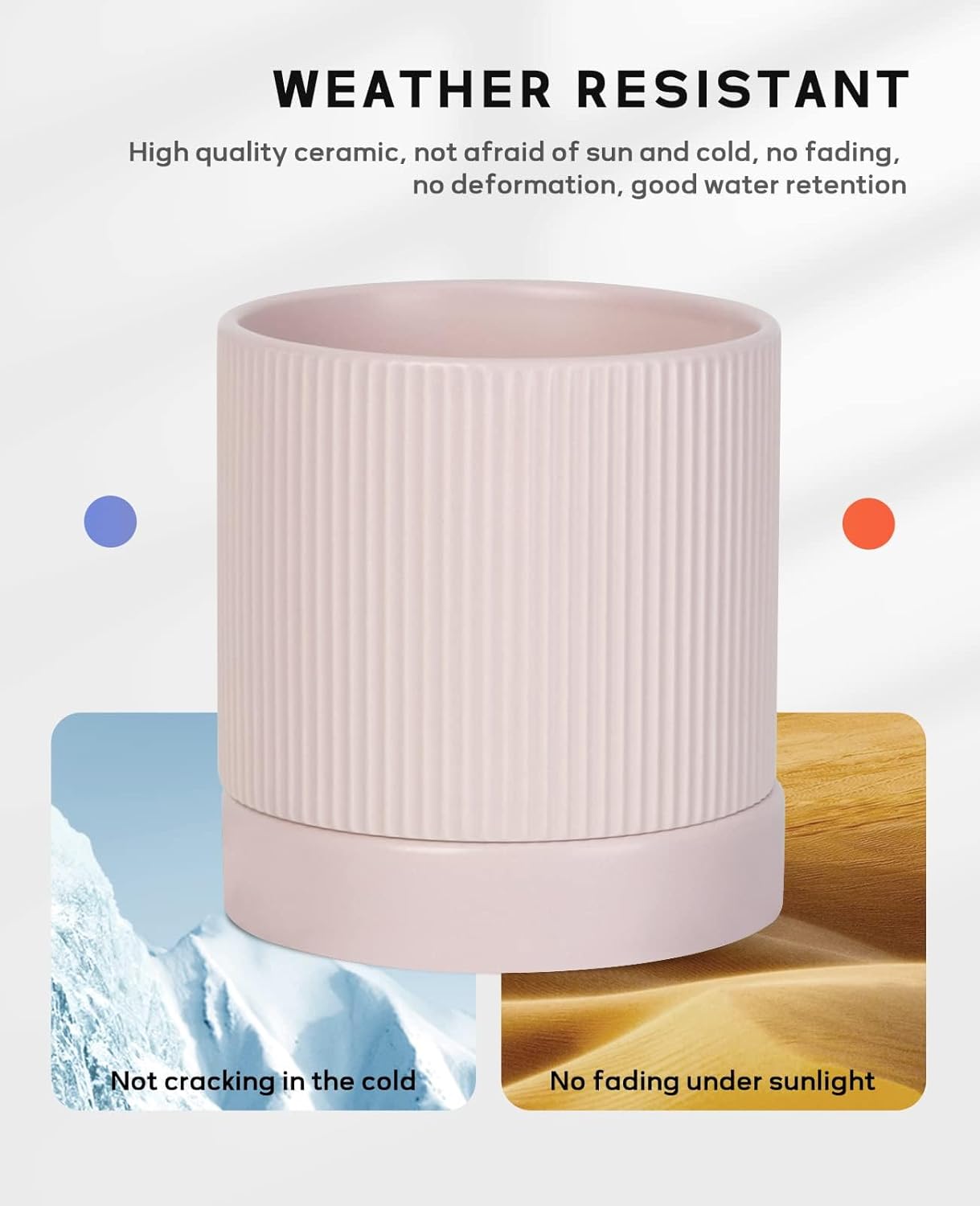 LaDoVita 3 Pack Ceramic Plant Pots 6/5/4 inch, Flowerpot for Indoor Plants with Drainage Holes and Tray, Outdoor Garden Planters, Modern Decorative for Home, Pink Vertical Stripes
