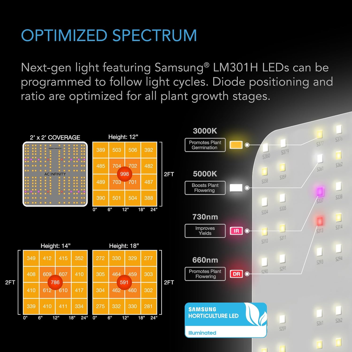 - Next-gen EC-motor inline fan 4”, clip fan 6”, and full-spectrum 2x2 grow light with Samsung LM301H LEDs.