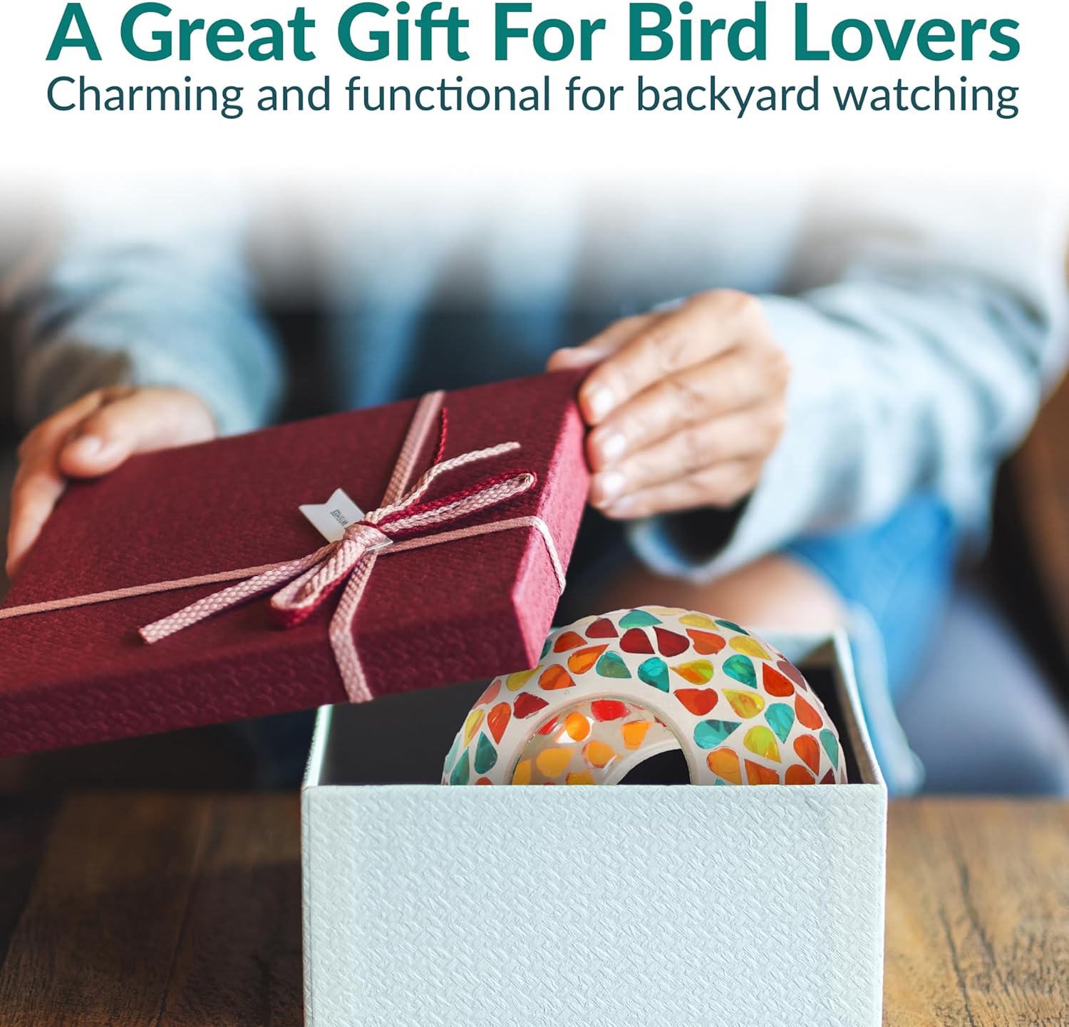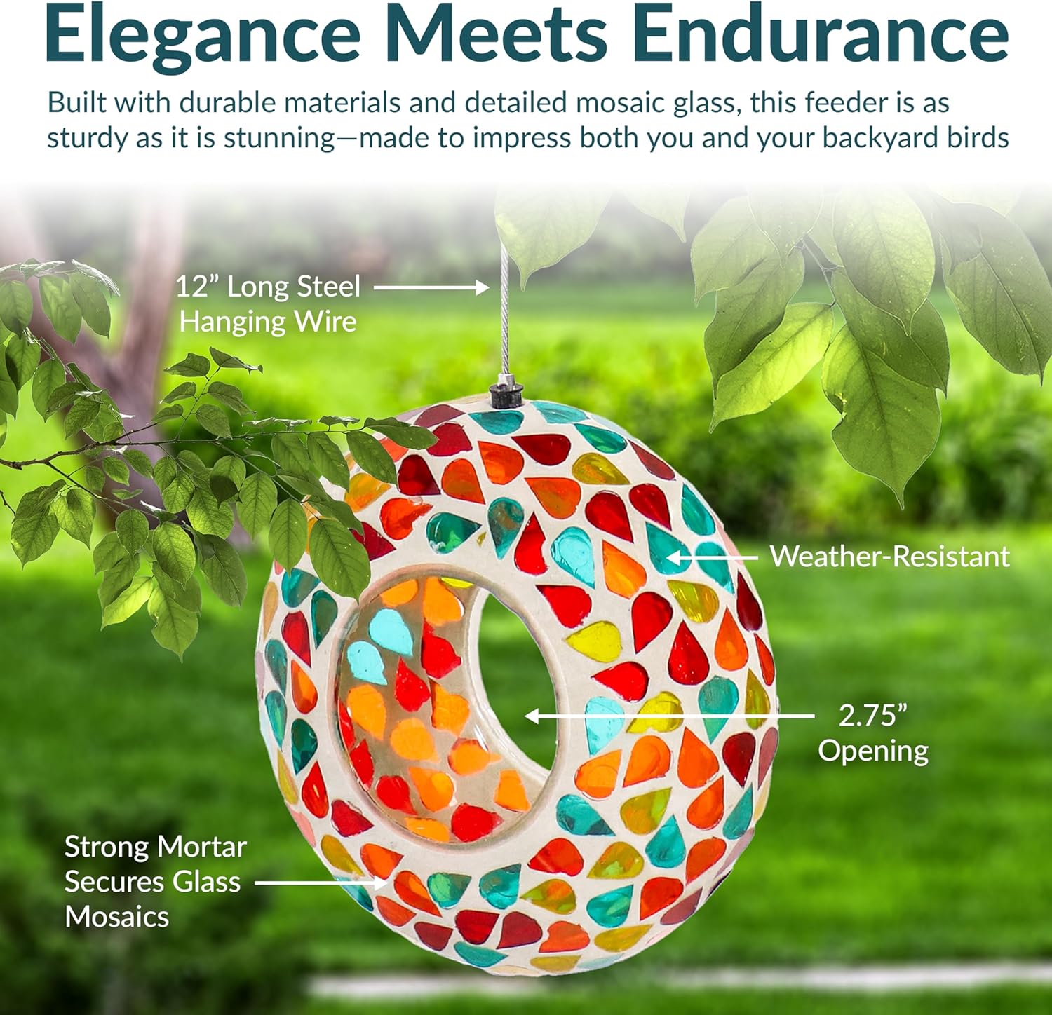 - ATTRACT BIRDS TO THE YARD: This cute bird feeder features vibrant colors and a mosaic glass construction that is sure to appeal to humans and birds alike. The bright colors and reflective material will help attract a variety of bird species to the feeder including cardinals, finches, sparrows, and more. Plus, it will add a stylish pop of color to any patio decor. The open fly-through design also makes it easier for birds to access the seed, encouraging them to come back again and again.