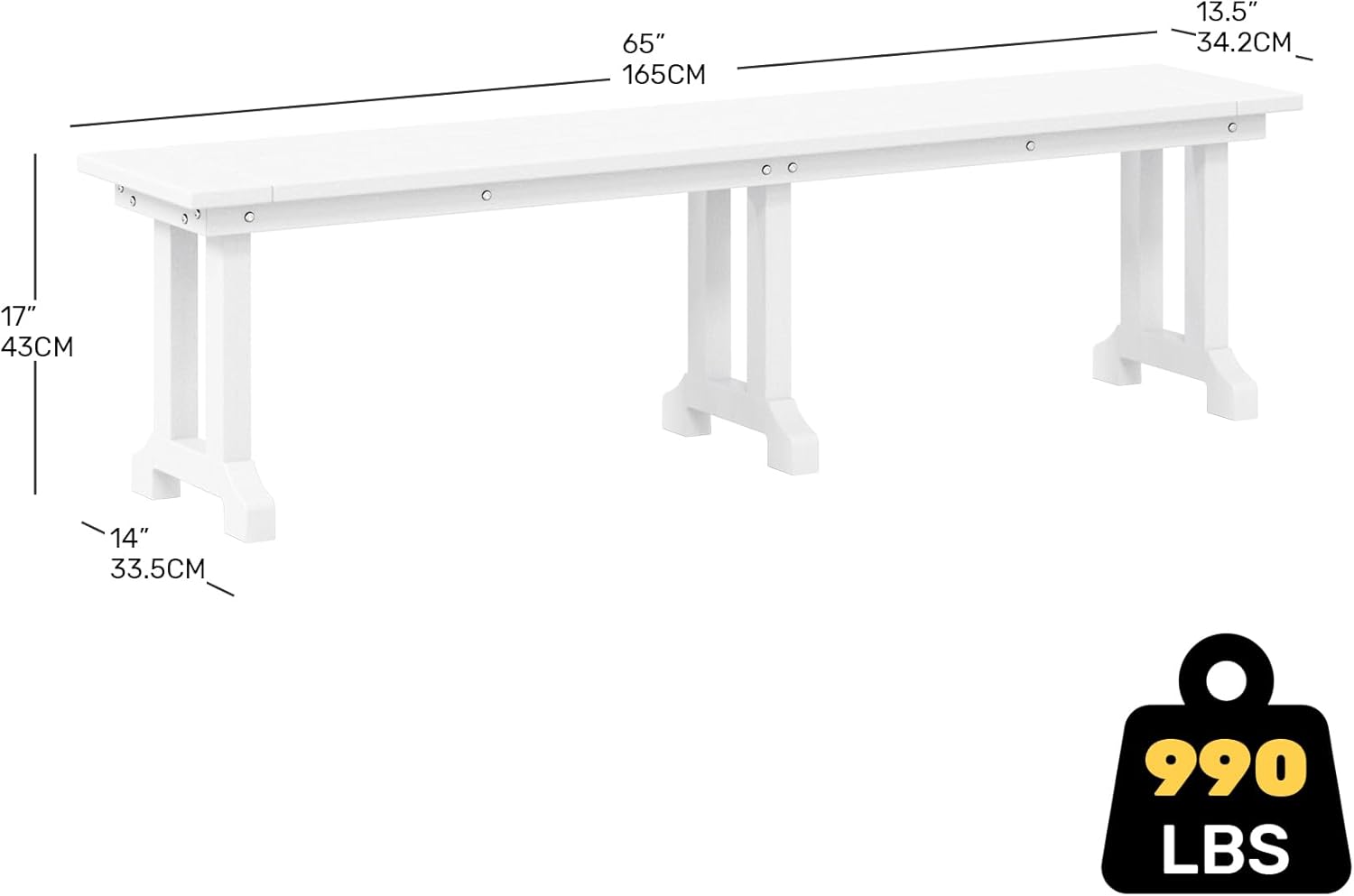 - Bench Specs - Overall: 13.4"D x 65"W x 17"H. Weight: 42 lbs. Weight Capacity 660 lbs. All assembly hardware and a easy-to-follow instruction manual are included in every box.