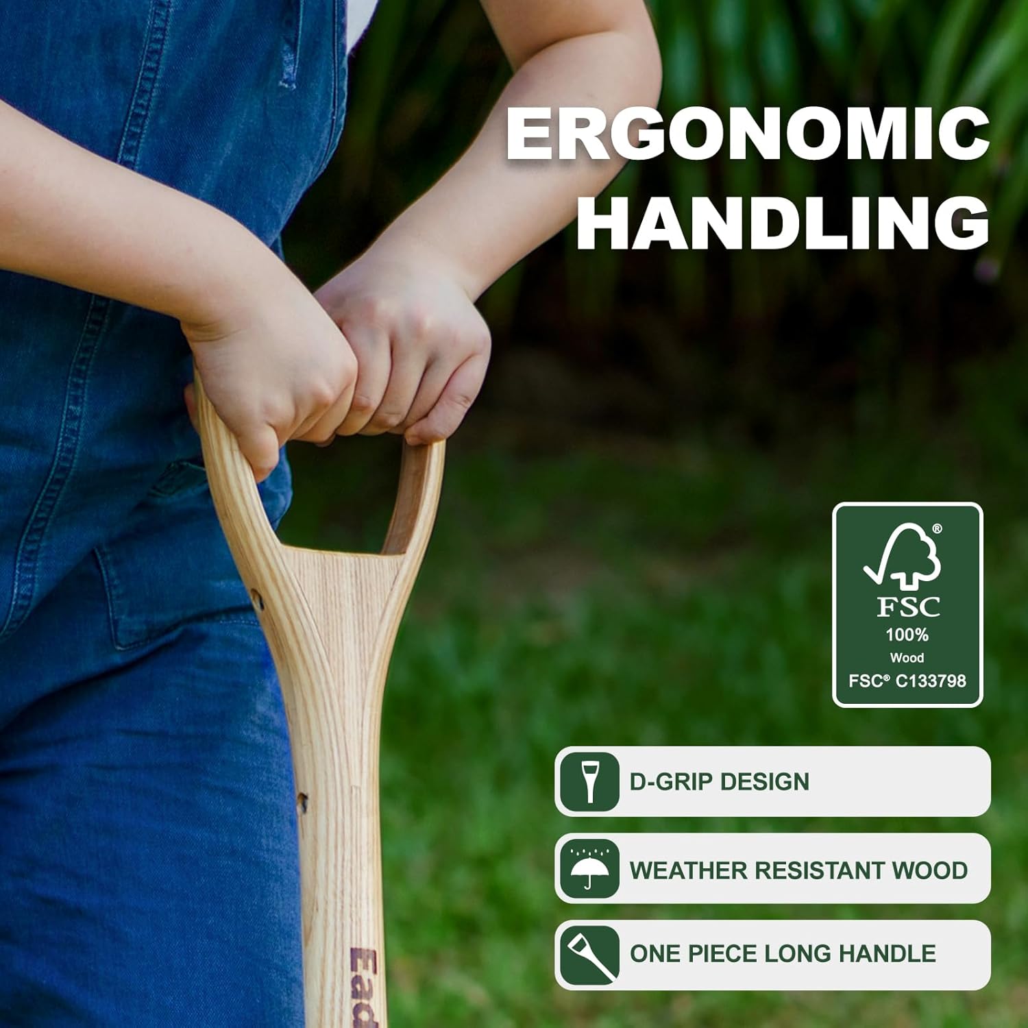 - COMFORTABLE D-GRIP HANDLE - The FSC certified Ash handle has a comfortable 'D' grip and is attached to the base via an extra-long, riveted strapped socket that introduces strength and an element of flex at this key joint. Sends lifting leverage to the lower handle to lift heavier loads with ease. Back saving design improves posture and reduces the need to bend.