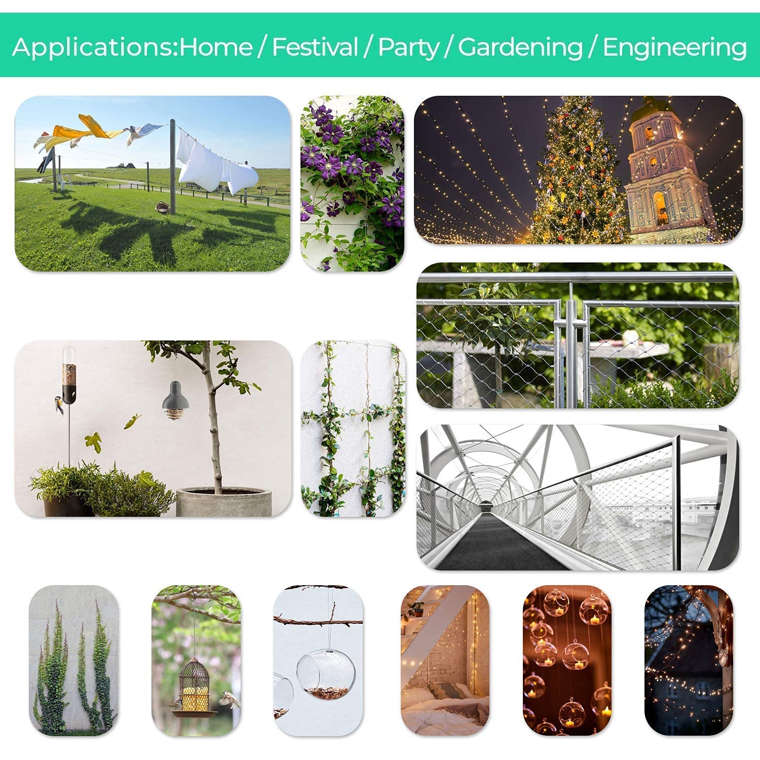 - 1/8" Stainless Steel Wire Rope :application suitable for shade sail hardware, curtain wire hanging system,globe lights hanging, patio lights hanging garden , hang pictures ,outdoor applications of tent rope, clotheslines, hanging outdoor lights, deck cable railing and etc.