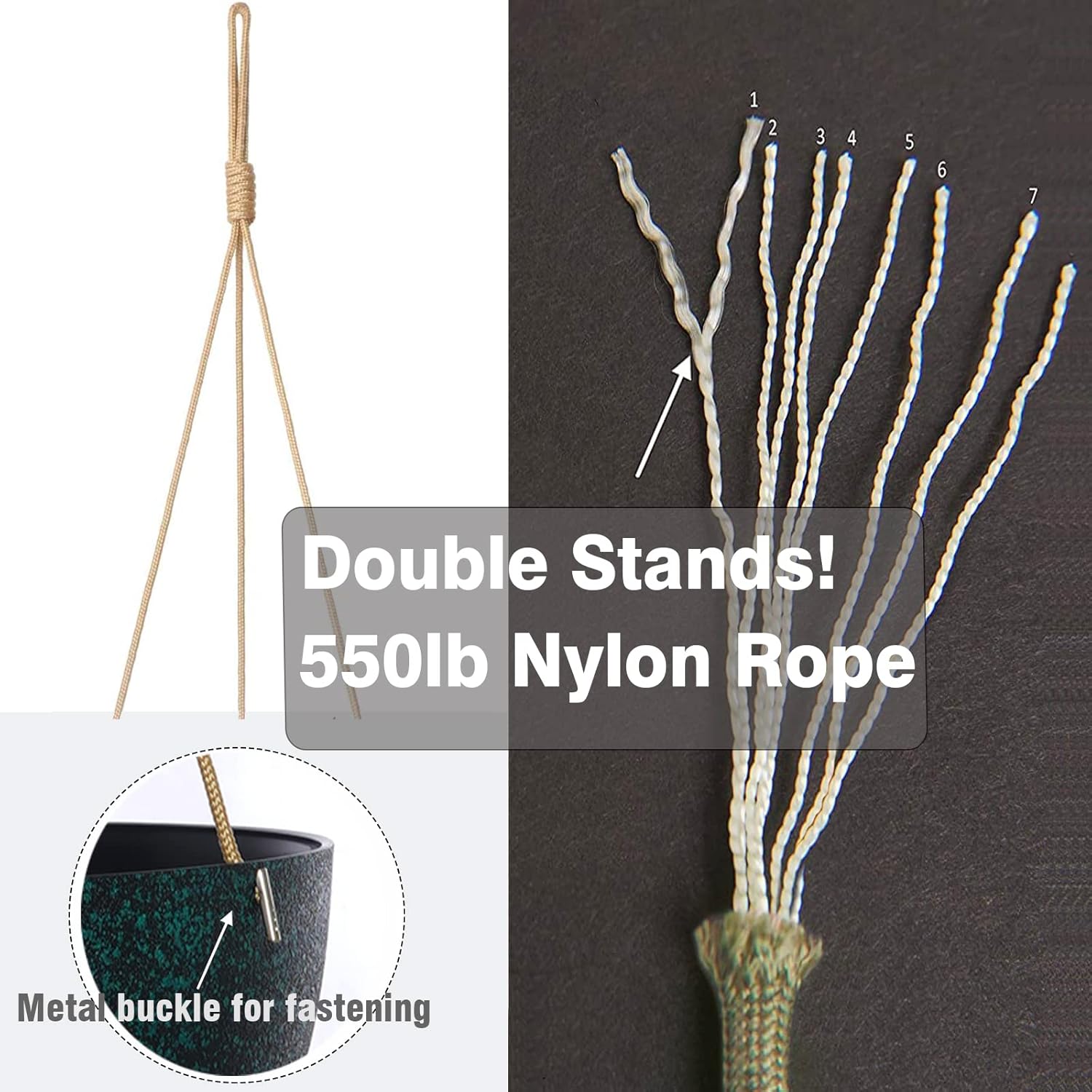 - [Adjustable Hanging Rope] Crafted from durable plastic with adjustable high-strength nylon rope, the pots are lightweight yet sturdy for easy transport. The hanging rope is made of sturdy nylon rope with excellent elasticity, you can freely adjust the height you want, the full nylon construction provides abrasion resistance, it can easily hang plants weighing up to 20 pounds without taking up any floor space, and take your plants to new heights.