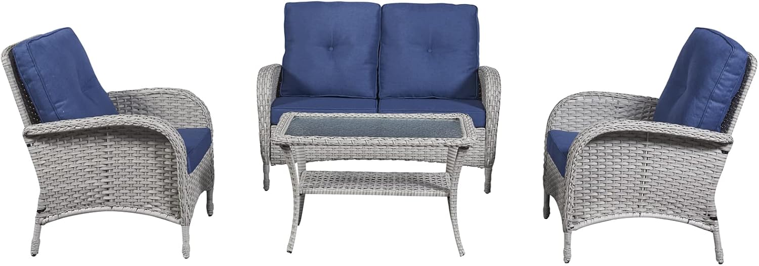 HUMMUH 4-Piece Patio Furniture Wicker Outdoor Conversation Set,All-Weather Rattan Outdoor Bistro Set with Loveseat Chairs Coffee Table for Backyard,Poolside,Deck