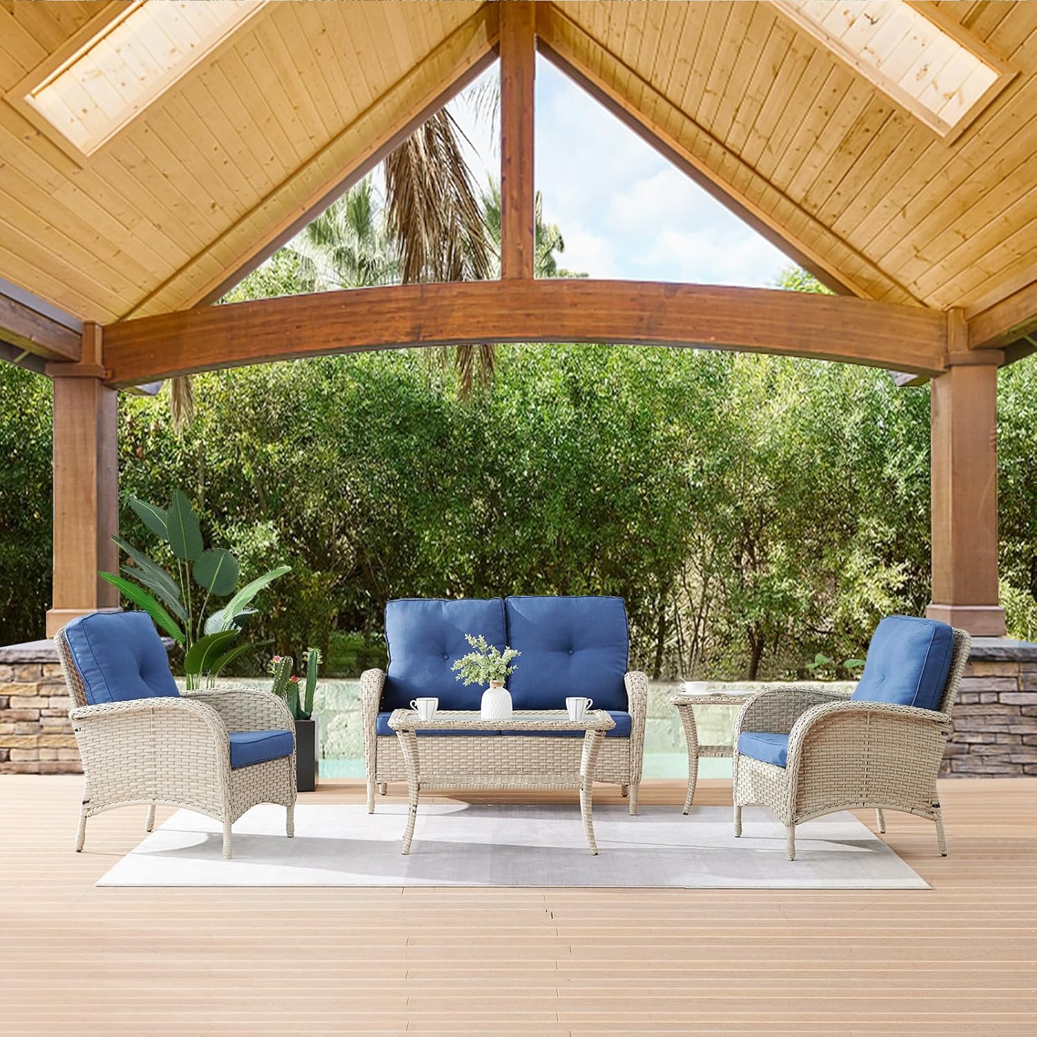 - Comfy Spot for Relaxation:Create an instant gathering spot on your porch or garden with this 4-person seating patio set.This outdoor sectional furniture includes one loveseat, two rotating gliding chairs, One 2-layers coffee table and a side table. 4'' Thick cushions add more comfortable experience.