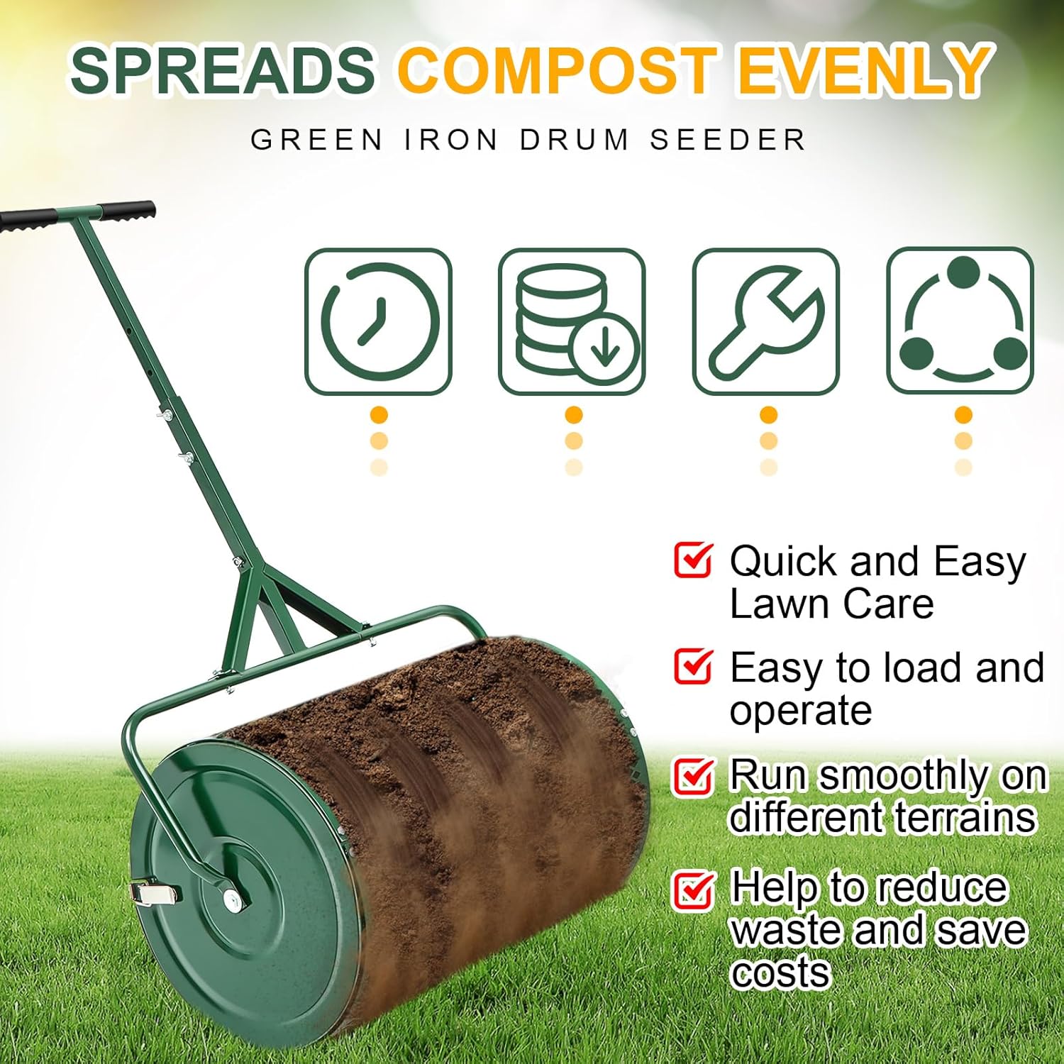 - Material You Can Depend on: lawn and garden compost spreader is heat treated, iron finish can resist rust and corrosion, strong and durable, lightweight materials and ergonomic design make lawn care more enjoyable and easy