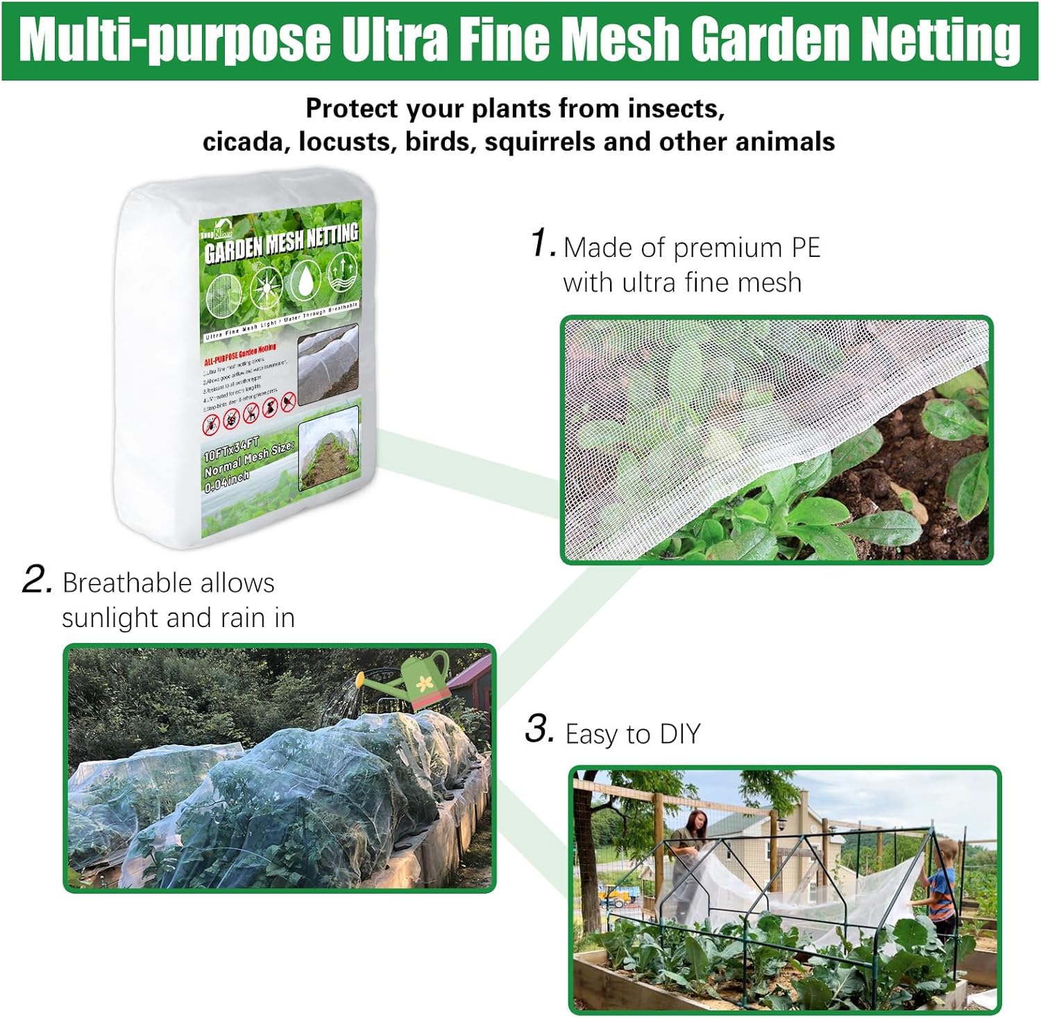 - Ultra-Fine Mesh Netting: Large size 10x34 feet provides more security. Ultra fine garden netting has a 0.8mm x1mm ultra-fine mesh, effectively protects vegetables, fruits and flowers.