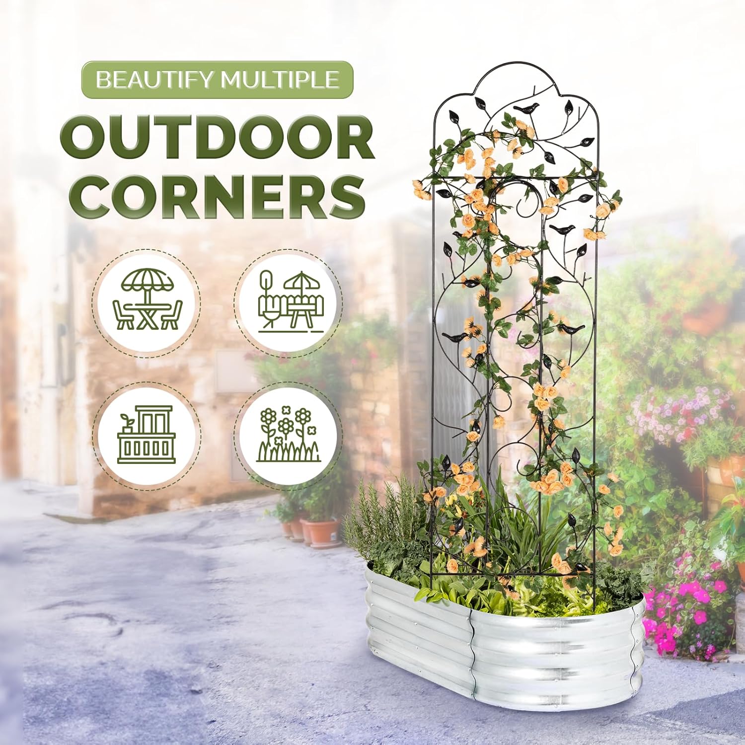- š BUILT FOR LONG LASTING BEAUTY: The high quality steel trellis for climbing plants with outstanding strength and durability provides solid support for climbing plants; Its powder coating protects it from rust and corrosion, ideal for outdoor use