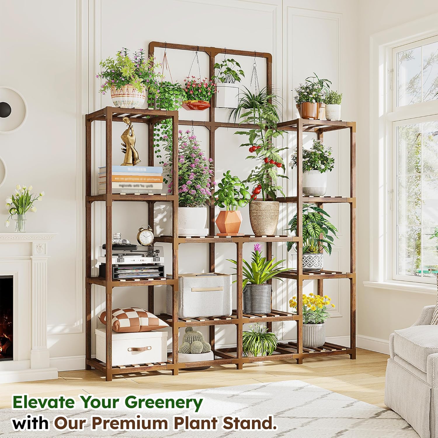- 【Large Capacity Plant Stand for 16-21 Pots and Space Saving Genius】Carefully designed wider shelves effortlessly hold more than 16 pots, providing a more spacious growing area for your tall plants, short plants, small pots or hanging plants etc, making each plant can stand in sunshine, absorb the balanced nutrients and sunlight in a comfortable environment. Open-frame design promotes air circulation and sunlight exposure, boosting plant health while adding chic decor. Maximize your greenery’s potential—revive your oasis now