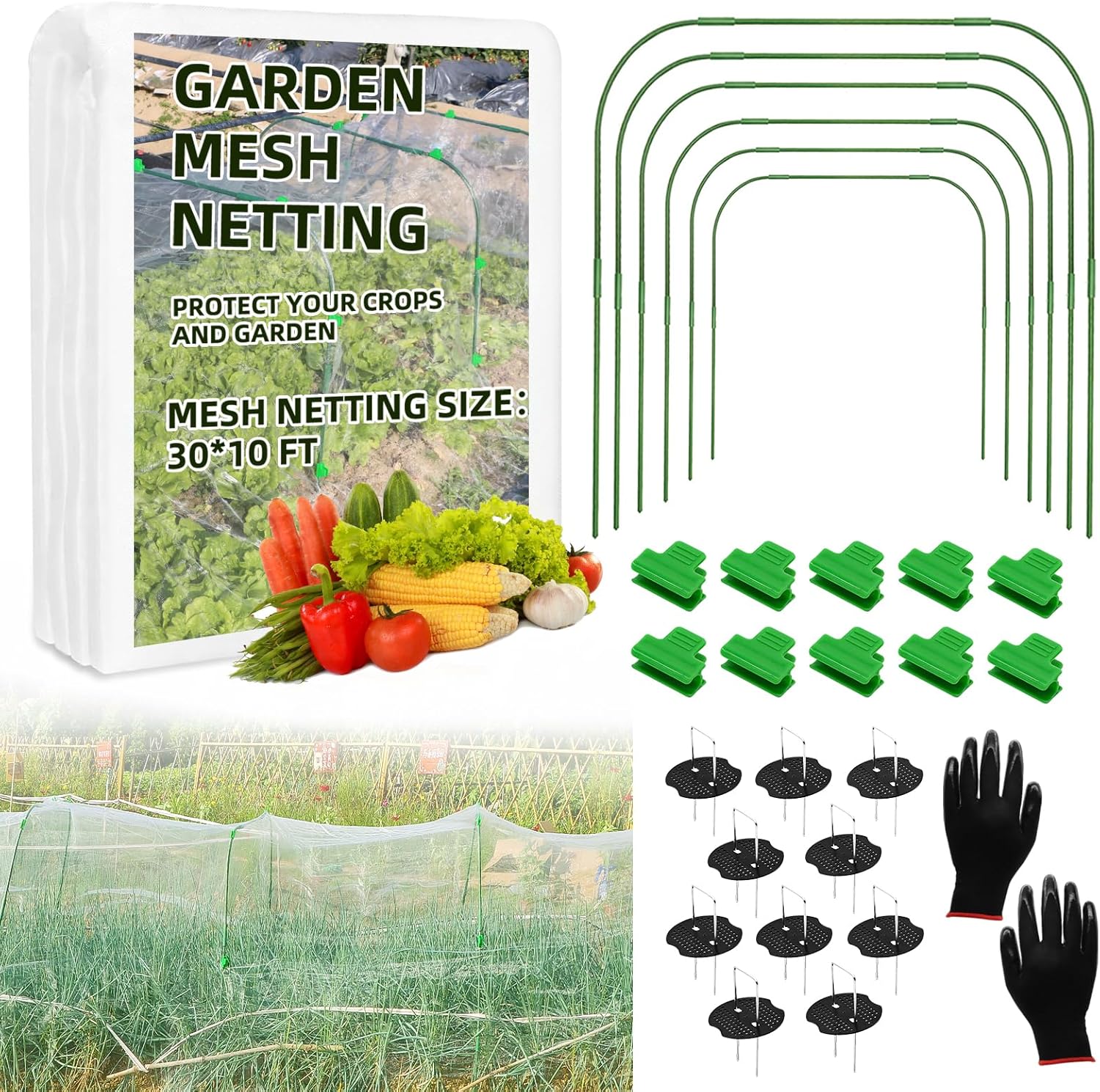 - [Thickened and Upgraded Garden Netting Kit ] Includes 10x30ft Ultra Fine Mesh Garden Netting, 36 Clips, 1 Pair of Gloves, 10 Sets of Ground Spikes and 6 Garden Hoop Kits. The garden netting has been thickened from 30g / 60-mesh to 32g / 60-mesh for improved filtration.