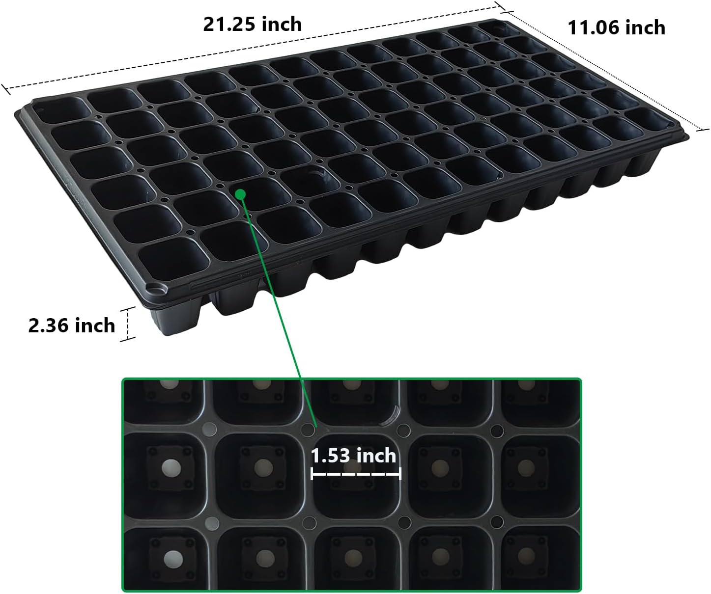 - Dimension: 21.25"×11", 2.36" Height, Seedling Starter Trays great with Planting Seed Starter Kit. 72 cell nursery tray, height of trays is 2.36 inches which just fits standard 1020 tray which height is 2.5 inches.