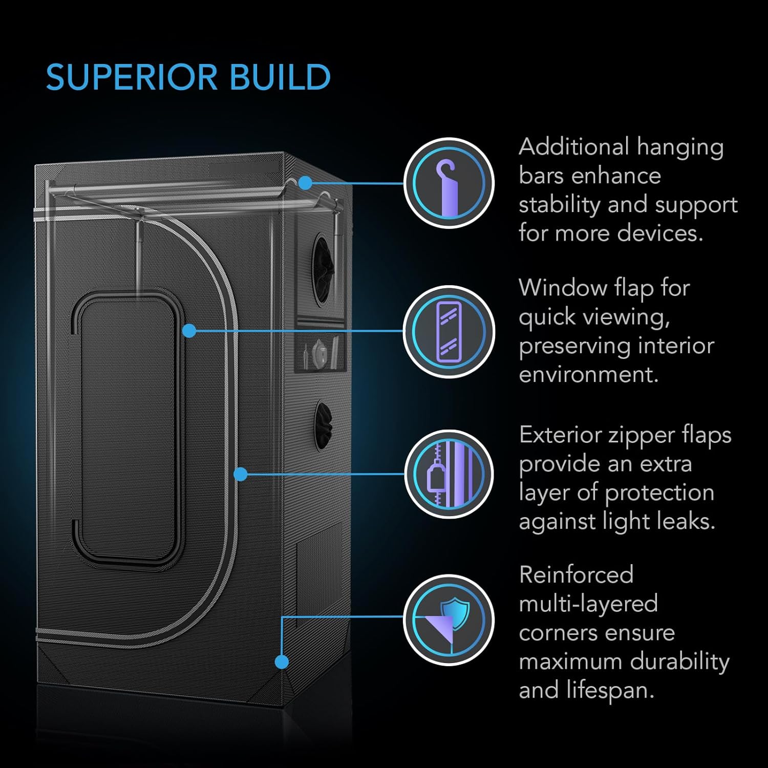 - Advance grow tent features lab-tested reflective Mylar for maximum light efficiency, taller window for clear visibility, and enhanced light-blocking design.