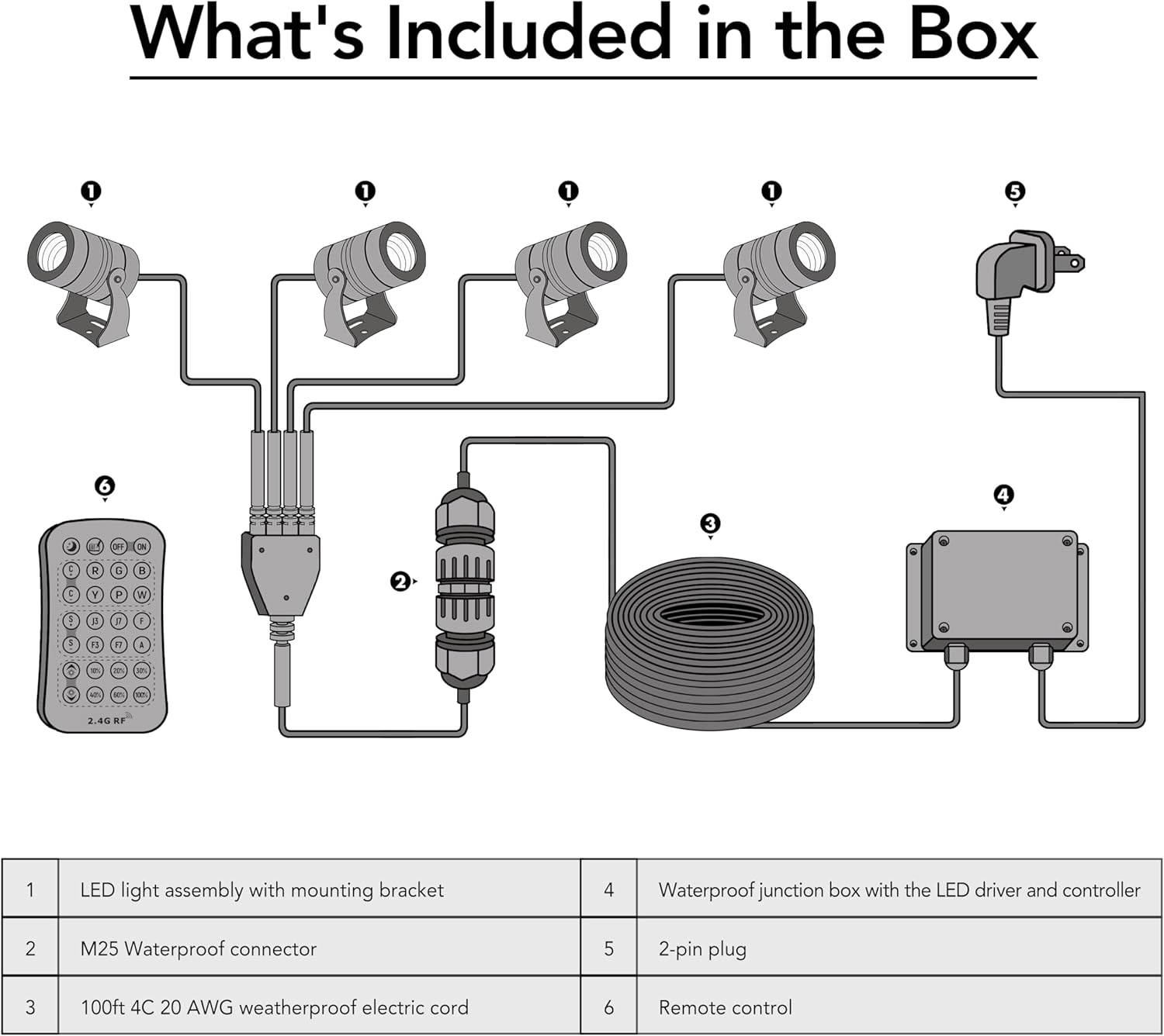 - 110V-120V system, 100' electric cord included. IP 67 certified.
