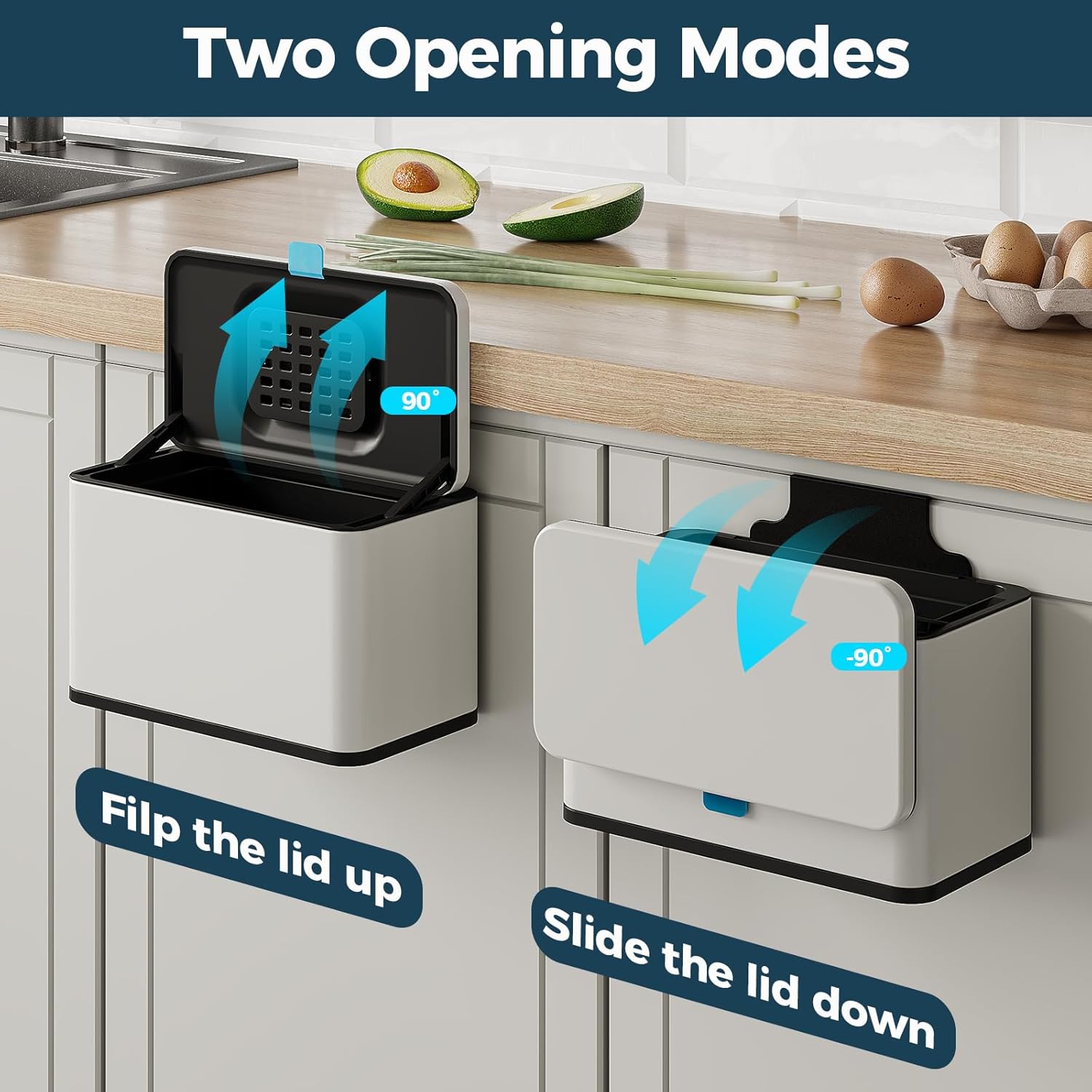 - Two Opening Modes - Flip up the lid or Slide the lid down, Come with a comfortable silicone carrying handle allows you to dispose of the waste quickly and cleanly with a simple pull or slide, depending on your habits and position.