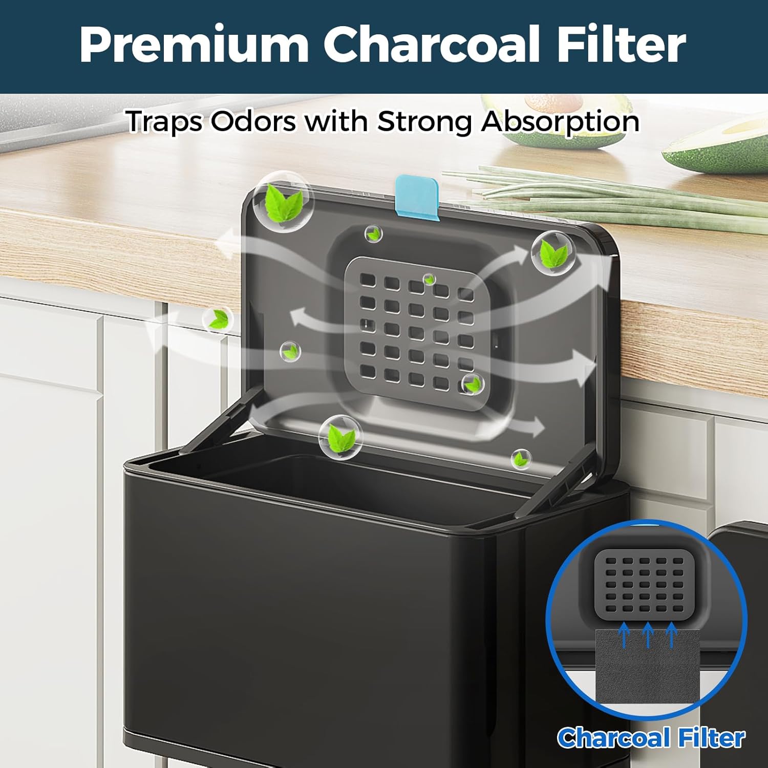 - Odor Absorbing Filter - The activated-charcoal filter included inside this trash can (NOT in other brands) traps and absorbs odors without leaking funky smells. Stainless steel trash can with lid enhances the sealing effect, specifically designed to hide smelling and fruit fly free.