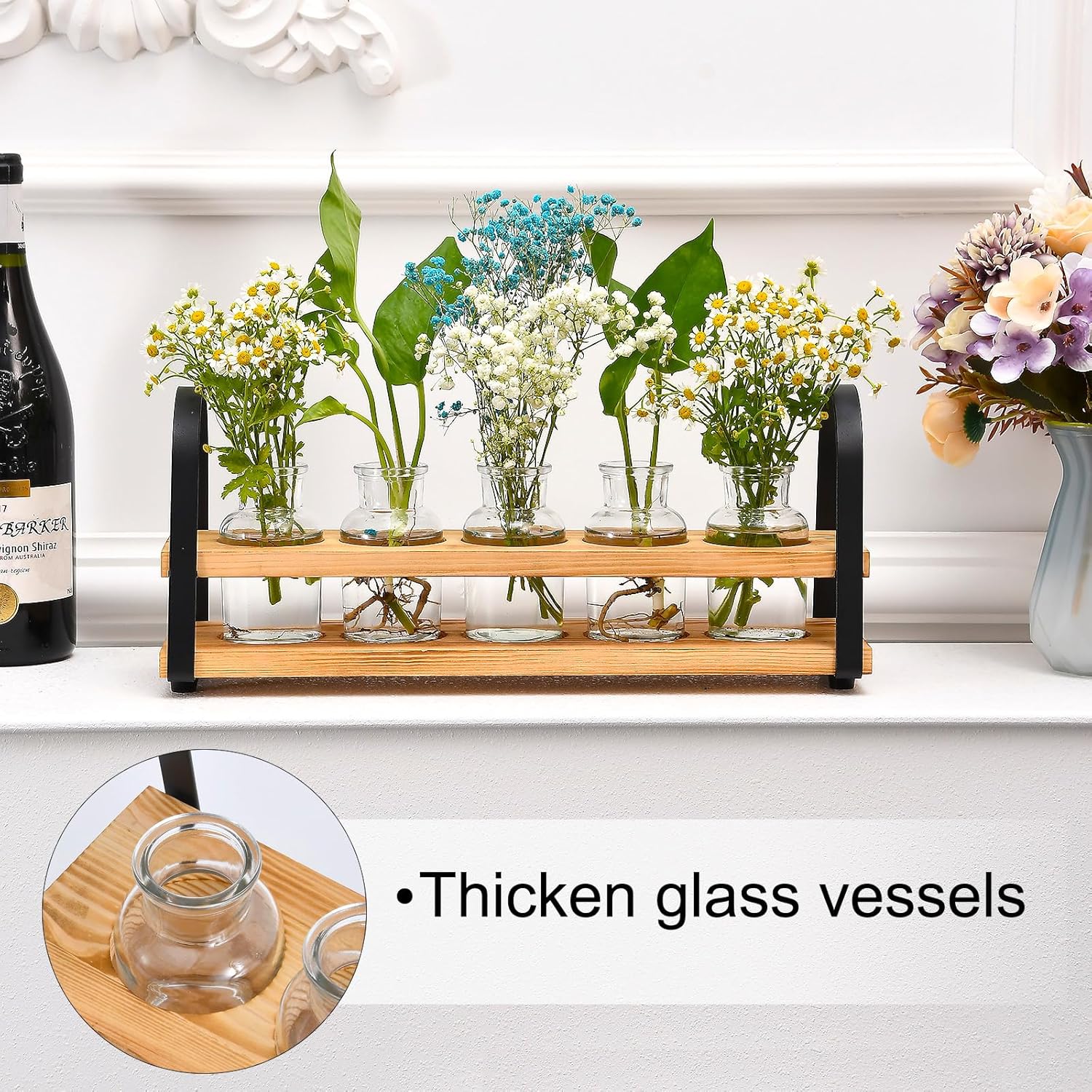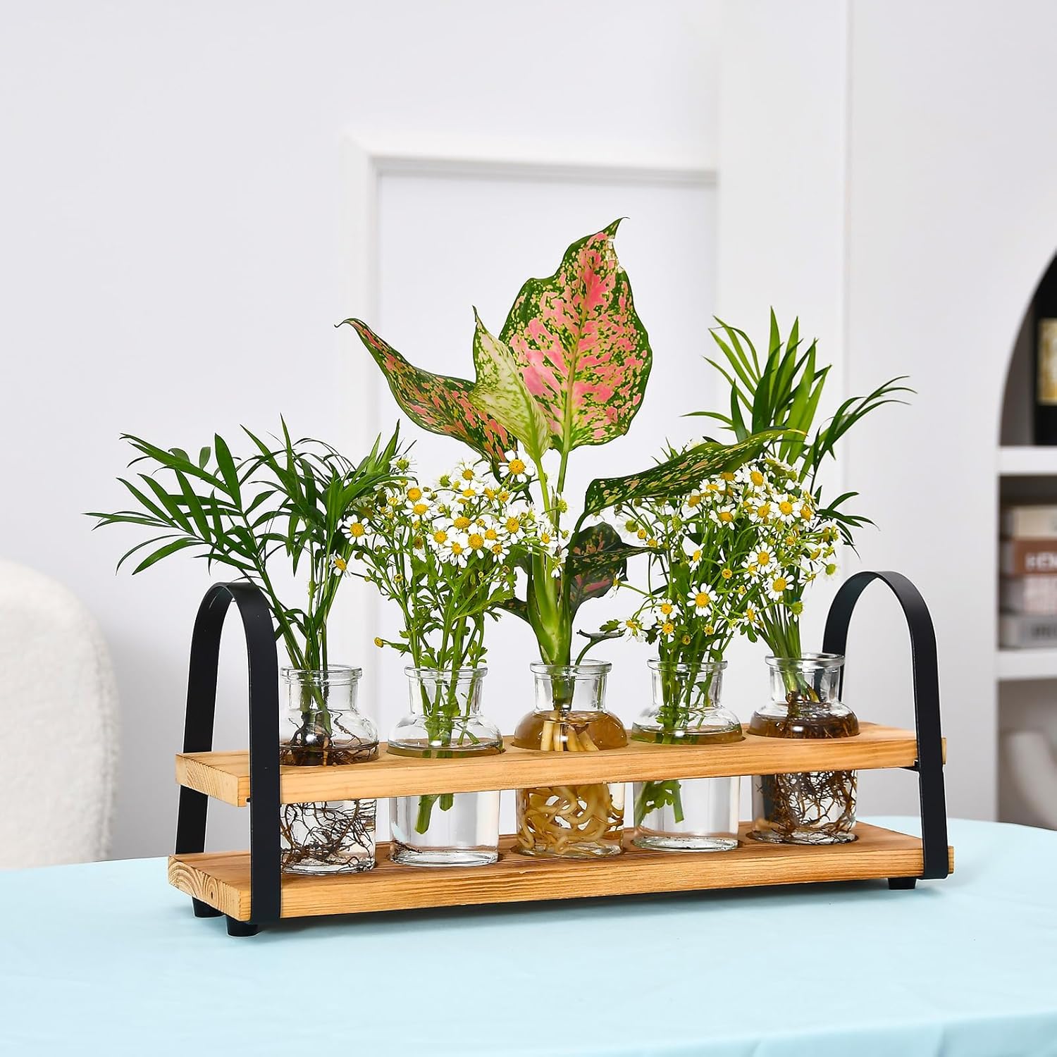 Plant Propagation Stations with Wood Stand, Desktop Plant Terrarium for Propagating Hydroponic, Flower Vase for Home Kitchen Office Decor, Plant Lover Gifts