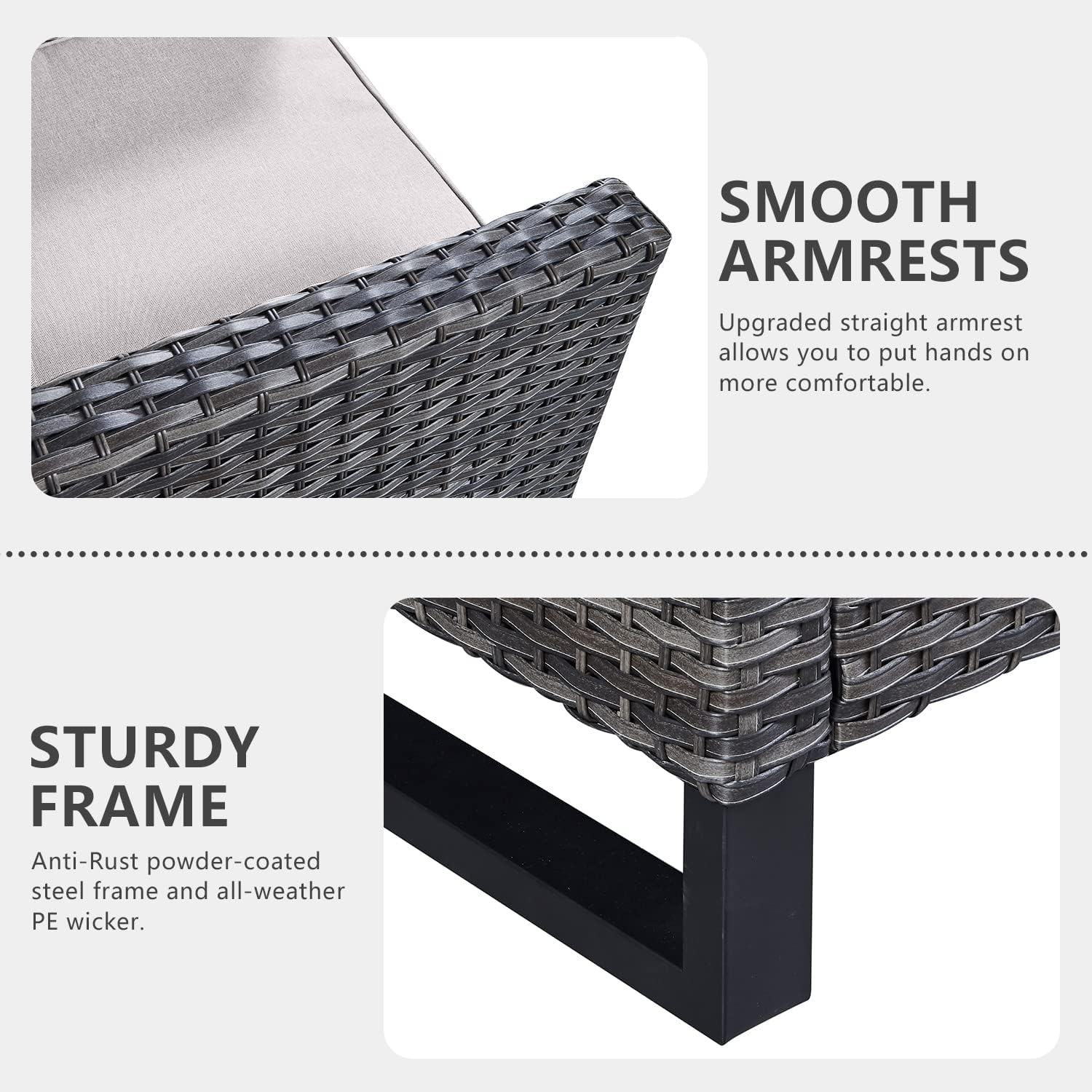 - 【Sturdy&Durable】All made with Anti-Rust powder-coated steel frame and All-weather Hand-Woven PE wicker to make this patio furniture set is resistant to UV and weather,The upgrated rectangle feet of couch and chairs which is firm and sturdy.