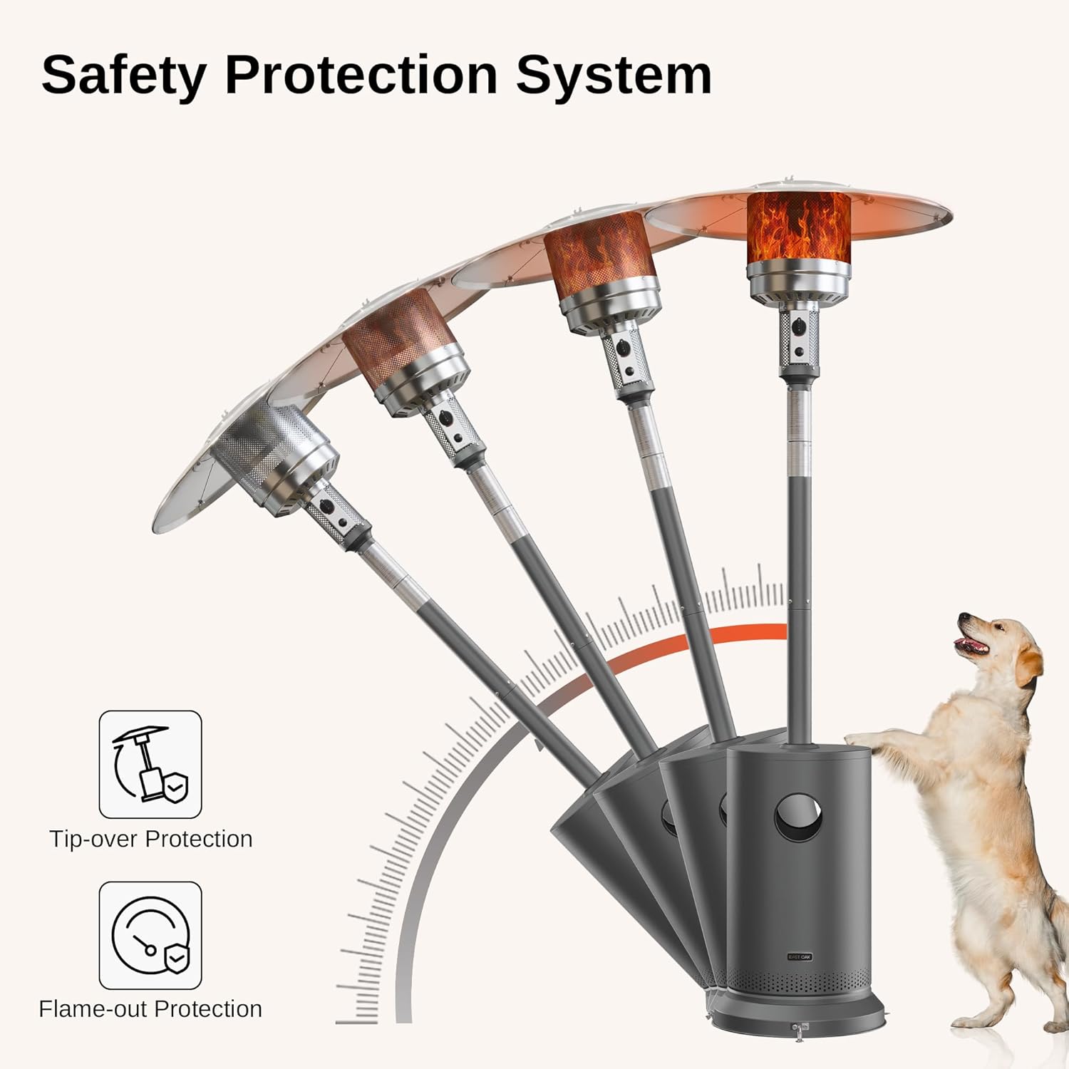 - š¦š®š³š²šš š£šæš¼šš²š°šš¶š¼š» š¦šššš²šŗ: The Tip-over Protection system will shut off the flame when the patio heater propane is tilted more than 45 degrees. If the flame goes out, the Flame-out Protection system automatically shuts off the gas supply
