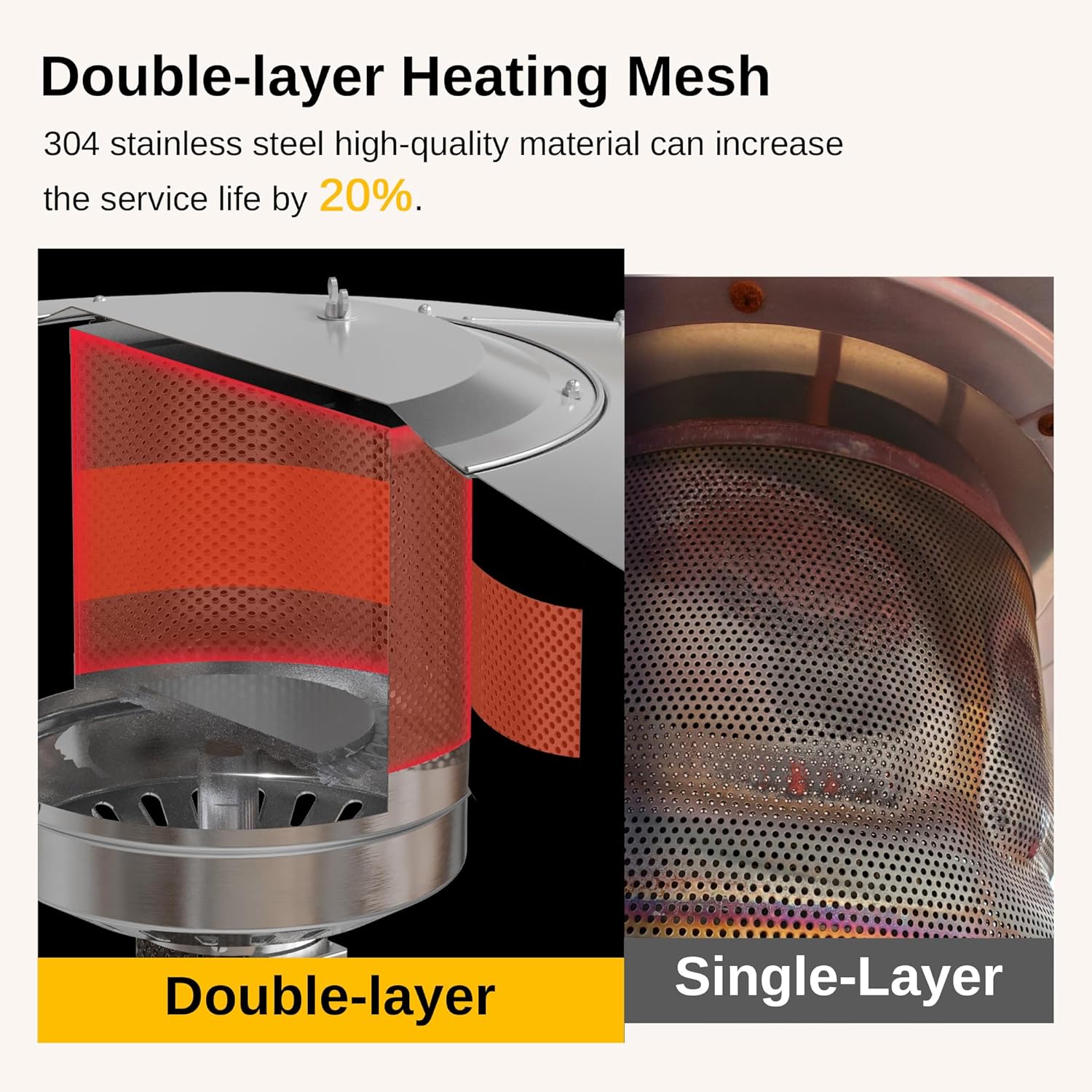 - š š¼šæš² šššæš®šÆš¹š² šš¼ššÆš¹š²-š¹š®šš²šæ šš²š®šš¶š»š“ š š²ššµ: High-quality 304 stainless steel is used in our double-cover heating mesh design. Compared with a traditional single layer burning mesh heater, the EAST OAK Outdoor Heater is stronger, more durable, and safer, and the service life is improved by 20%