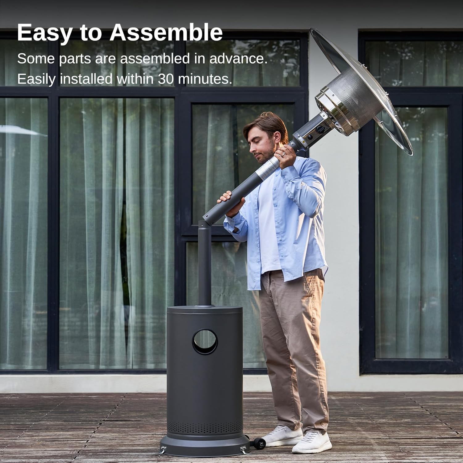 - šš®šš šš¼ šššš²šŗšÆš¹š² š®š»š± š š¼šš²: Some parts are assembled in advance, and the upgraded reflector shield only needs to be assembled with three reflector pieces. The installation of the entire product, following the instructions, can be completed in about 30 minutes. The Outdoor Patio Heater has two wheels on the bottom for smooth movement