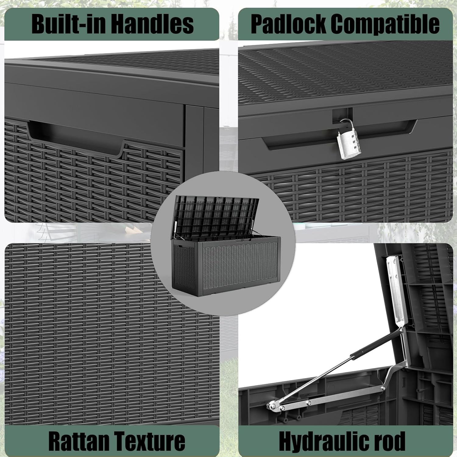 - All-Weather Waterproof Protection:Made with high-quality waterproof materials, this deck box keeps your belongings dry and safe from rain, snow, and humidity year-round.
