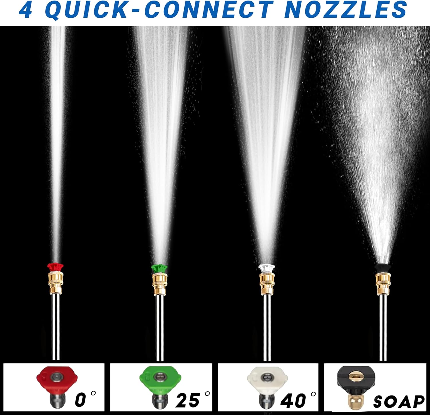 - [๐ ๐๐ฎ๐ข๐๐ค-๐๐จ๐ง๐ง๐๐๐ญ ๐๐จ๐ณ๐ณ๐ฅ๐๐ฌ - ๐๐ซ๐๐๐ข๐ฌ๐ข๐จ๐ง ๐๐ฅ๐๐๐ง๐ข๐ง๐ ๐๐จ๐ซ ๐๐ฏ๐๐ซ๐ฒ ๐๐๐ฌ๐ค ] Switch 4 quick-connect nozzles (0ยฐ, 25ยฐ, 40ยฐ, and soap) easily, each designed for specific tasks. From high-pressure jets (0ยฐ) for deep stains to a gentle 40ยฐ spray for delicate surfaces like vehiclesโthis washer covers every cleaning need with ease, for gutters, sidewalks, decks, patios, outdoor furniture, car/RV, mechanical maintenance, and home remodeling.