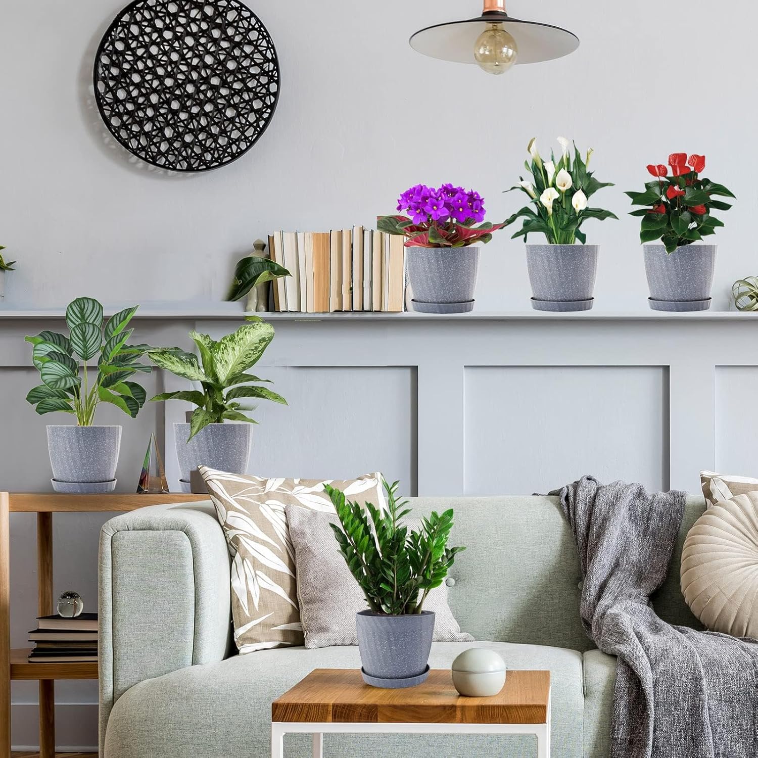 - DECORATION YOUR HOME GARDEN - 6 pack 7 inch planters with grey color, transplant plants to these pots, fill up with mix soil, water and let drain, then place a saucer under each plant. Brings a new stylish home garden. Pefect for hanging up or placed on windowsill, shelf, bedroom, kitchen, office, desktop, garden, etc.
