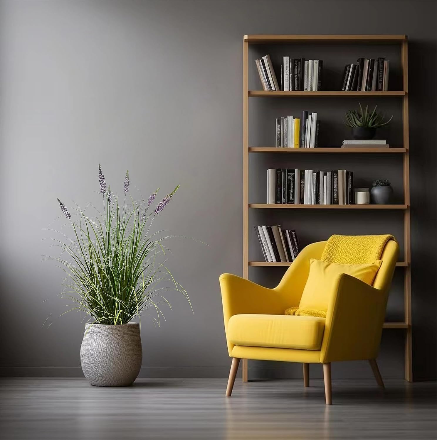 - 1.This faux plant features close to natural green grass with 5 lavender flowers, all inside a durable and solid flowerpot. Artificial lavender fake tall grass is 47 inches high.base with a black plastic pot in 5'' dia ,5.9''high.itβs easy to put it in a nice bigger planter as desired.