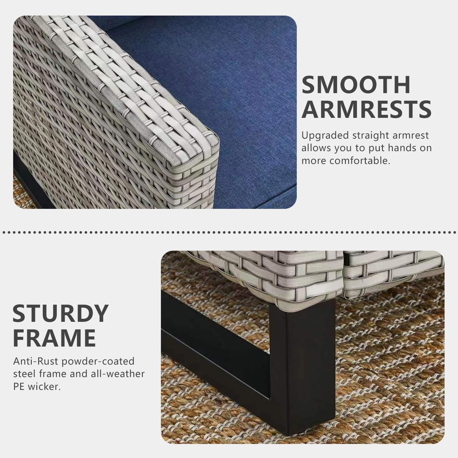- 【Sturdy&Durable】All made with Anti-Rust powder-coated steel frame and All-weather Hand-Woven PE wicker to make this patio furniture set is resistant to UV and weather,The upgrated rectangle feet of couch and chairs which is firm and sturdy.