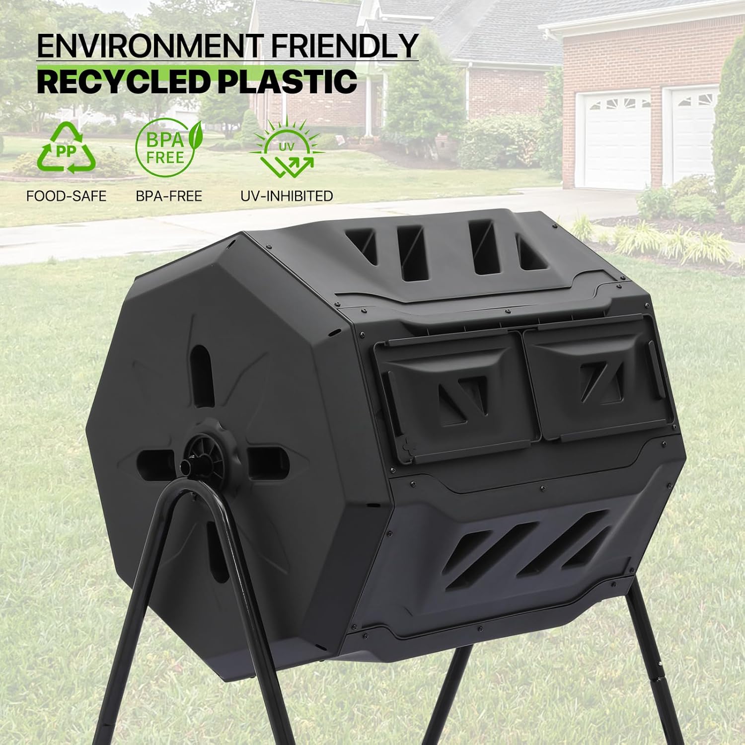- Large Capacity: With a large capacity of 43 gallons (160 L), give your plants the nutrient-dense fertilizer they need and watch your garden bloom like never before! With a dual-chamber design tumbling composter, you get two compartments for faster and more efficient composting all year round.