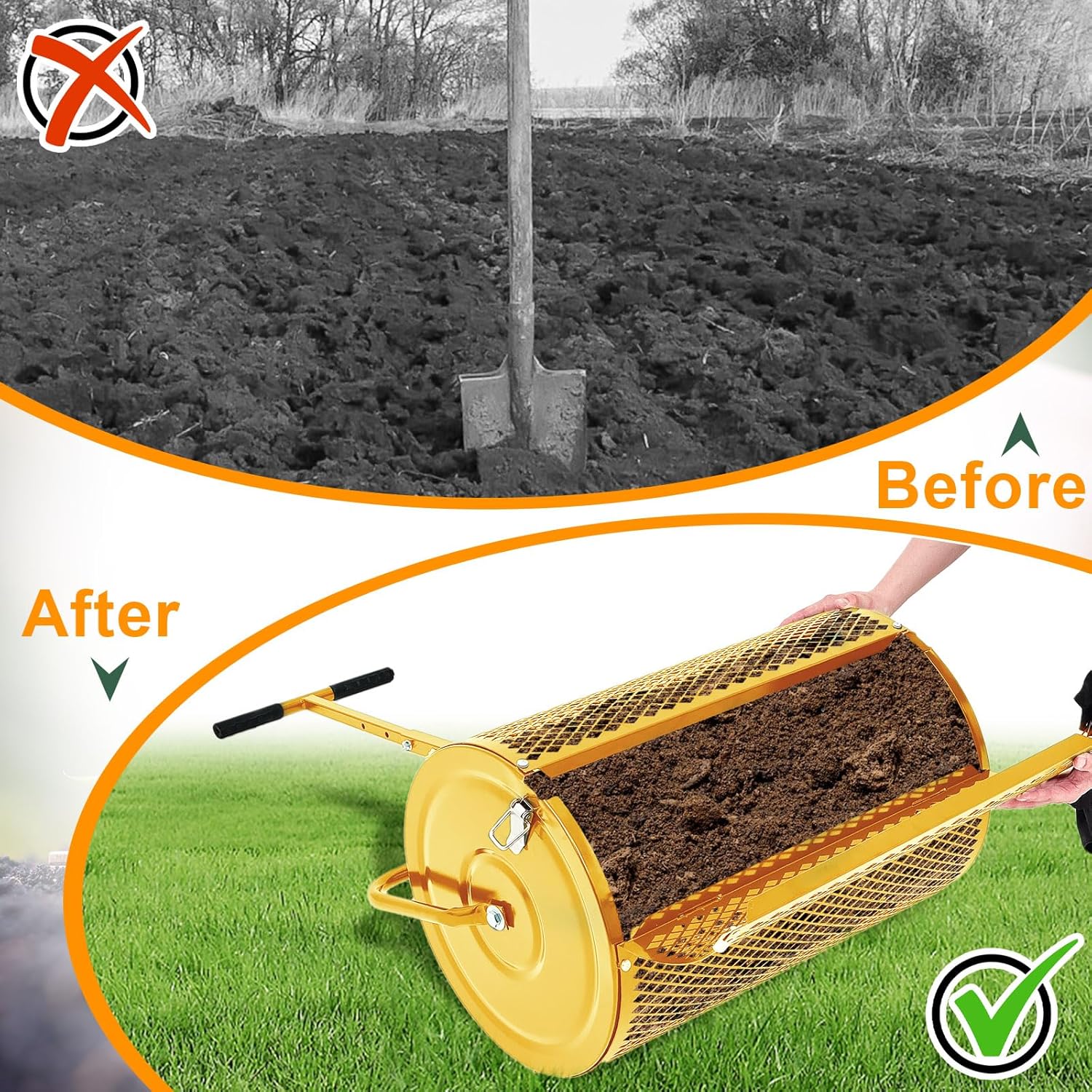 - Quick and Easy Lawn Care: 0.4 x 0.8 inch mesh holes allow product to break up lumpy material when rolled and spread peat moss, topsoil, compost, mulch evenly and quickly on lawns, patios, gardens, help to reduce waste and save costs, compared with traditional shovels, it can well improve efficiency