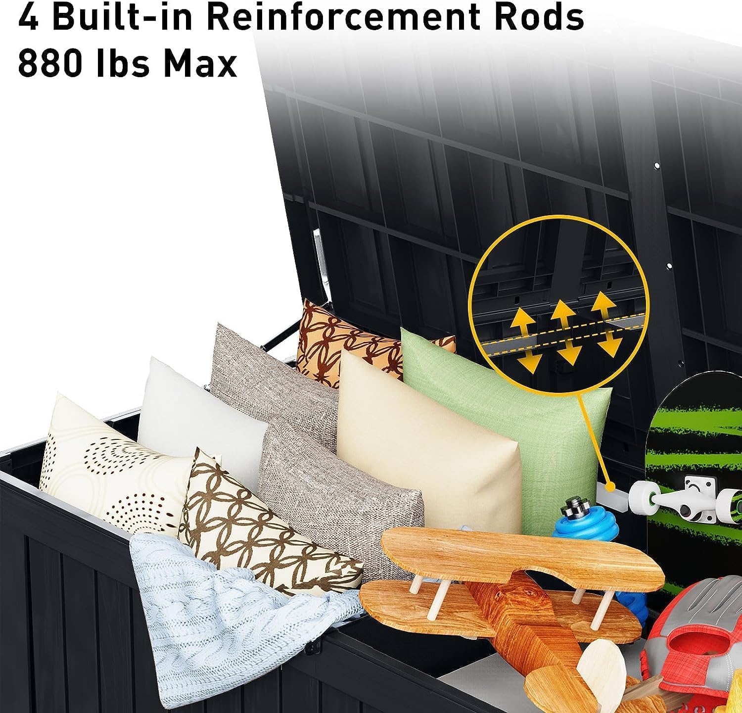 • ROBUST AND RELIABLE DESIGN - Engineered for heavy-duty use, this deck box can support up to 900 lbs, thanks to its reinforced metal rods and internal supports. Its thicker (0.08'') panels and precise assembly ensure superior stability and prevent warping or deformation over time.