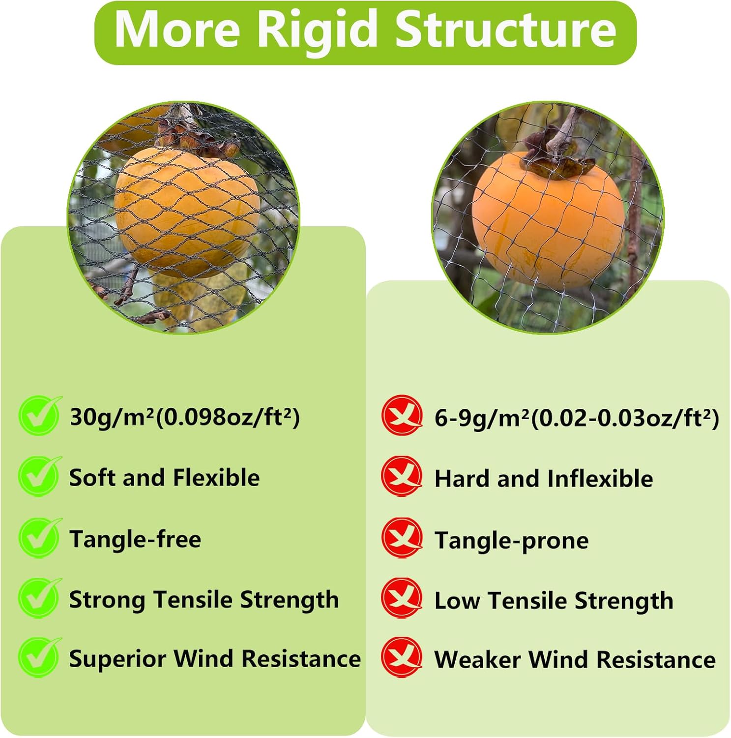 - Long-Lasting Protection for Your Plants: Made from high-quality, UV-resistant, high-density polyethylene (HDPE) material, this bird netting for chicken coop ensures long-term durability and flexibility. Weighing in at 30g/m²(0.098oz/ft²), this plastic netting is significantly stronger than typical market options 6-9g/m²(0.02-0.03oz/ft²). Unlike traditional nylon or polypropylene, HDPE provides excellent strength while remaining lightweight, withstanding extreme weather conditions. This bird mesh netting is rot-resistant, anti-aging, and reusable, ensuring long-lasting protection for plants and gardens throughout multiple seasons