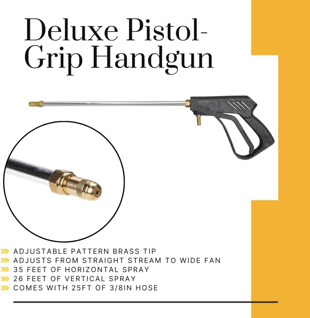 - REACH HARD SPOTS: Deluxe handgun sprays up to 35 feet horizontally and 25 feet vertically. Easily treat trees, ditch lines, or targeted areas without repositioning the sprayer
